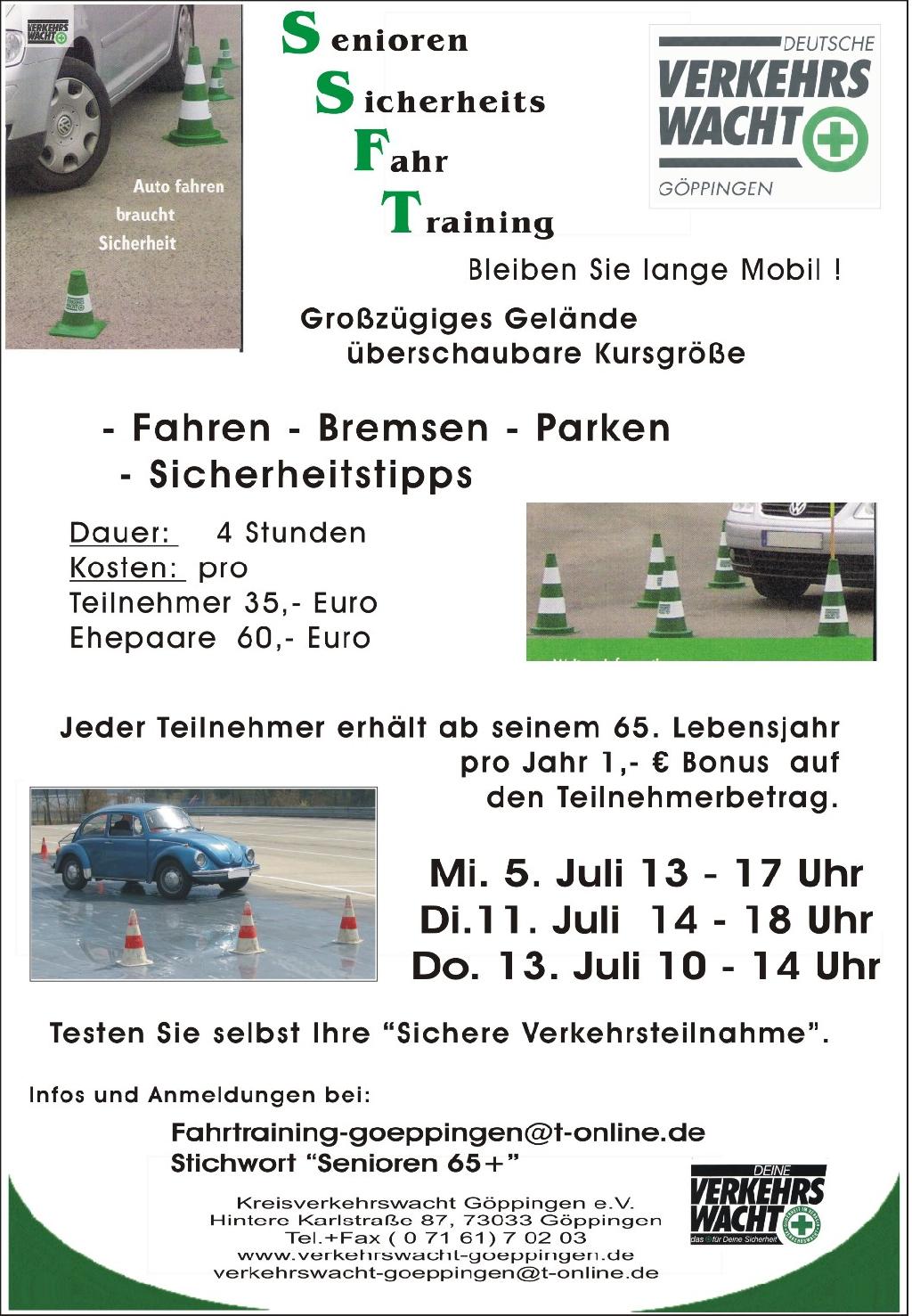 Zur Förderung der Verkehrssicherheit, gewährt die Kreisverkehrswacht Göppingen e.V. der Generation „65 plus“ im Rahmen der Themenkampagne (Schulterblick, sicher-fit-unterwegs und mobil bleiben) jedem Teilnehmer ab dem 65. Lebensjahr, pro Lebensjahr einen Rabatt von € 1,-.