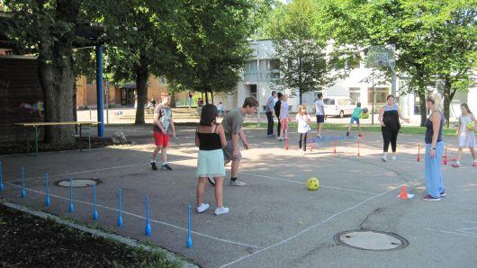 In Gruppen aufgeteilt durchliefen die ca. 40 Schüler und Schülerinnen die einzelnen Stationen. Hiervon gab es drei unterschiedliche Arten: Wettkampfstationen, bei denen sich die Gruppe nochmals aufteilte und gegeneinander spielte, wie zum Beispiel bei der Pedalostafette oder beim Hockey. Einzelspiele, bei denen jeder für sich ein festgelegtes Ziel treffen musste, so zum Beispiel beim Torwandschießen oder beim Basketballkorbtreffen. Auch Gemeinschaftsstationen kamen zum Einsatz, hierbei mussten sich die Kinder und Jugendlichen gegenseitig unterstützen, um zum Ziel zu kommen. Sehr gut wurde dies bei der Station am Klettergerüst deutlich, denn hier durfte der Boden zu keiner Zeit berührt werden. Die Schüler und Schülerinnen der Pestalozzischule nahmen das geführte Bewegungsangebot sehr gut an und hatten während den einzelnen sportlichen Aufgaben sichtlich ihren Spaß.
