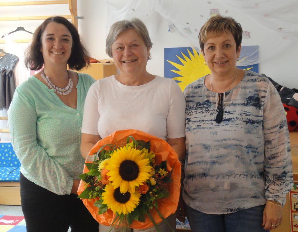 Mit Brigitte Schusser arbeitete sie von Beginn an in einem harmonischen Team. Wie schwer ihr der Abschied fiel, ließ sich aus den für die Verabschiedung gedichteten Zeilen heraushören, die gemeinsam mit den Kindern vorgetragen wurden. Ein Fotoalbum wird Sabine Bertele noch lange an ihr Wirken im Kindergarten erinnern. Auch die Eltern sagten Danke mit einem Strauß leuchtender Sonnenblumen und einer Gartenbank, auf der die Namen der Kinder ihrer Abschiedsgruppe eine schöne Erinnerung bleiben werden. Seitens der Stadtverwaltung dankte die Leiterin des Sachgebietes Bildung und Betreuung, Petra Grus, der angehenden Ruheständlerin für ihren unermüdlichen Einsatz für ihre Schützlinge.