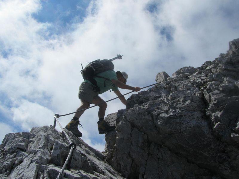 Ausgangspunkt einer 3-tägigen Bergfahrt im Karwendel war der Bahnhof in Hochzirl. Mit der ÖBB fuhr man ein paar Stationen nach Allerheiligenhöfe. Über den Wallfahrtsort Höttinger Bild wurde das Tagesziel, die Höttinger Alm (1487 m) erreicht. Am nächsten Morgen stieg man über den Schmidhubersteig zum Frau Hitt Sattel hinauf. Ehe es über Gehgelände zum Einstieg am Südgrat der Vorderen Brandjochspitze (2559) ging. In leichter Kletterei wurde der mit Drahtseilen und Krampen gut versicherte exponierte und markante Gipfel erklommen. Gute 2000 Meter über Innsbruck gab es großartige Blicke ins Karwendel. Jenseits des Inntales schweiften die Blicke zu den Zillertaler- Tuxer- und Stubaier Alpen. Bei besten Wetter genoss man eine volle Stunde das zauberhafte Panorama . Analog der Aufstiegsroute ging es zurück zum Frau Hitt Sattel, dem Übergang vom Inn- ins Gleirschtal. Durch ein steiles felsdurchsetztes Schuttkar, an kniffligen Stellen drathseilversichert, folgte ein langer Hatsch zur Möslalm (1262). Achteinhalbstunden ab Höttinger Alm. Anderntags führte der Weg durch das Große Kristental zum Solsteinhaus (1806) und weiter zur Neuen Magdeburger Hütte (1633 m). Auf dem Verbindungsweg der beiden Hütten, dem Zirler Schützensteig, war wiederum erhöhte Vorsicht, Trittsicherheit und Schwindelfreiheit gefragt. Mit Drahtseilen und Stiften gut versichert führte der Steig durch das felsige Gelände der Nordflanke des Großen Solstein. Über die Kirchberger Alm und den Zirler Mähder stieg man hinab zum Ausgangspunkt. Dauer ab Möslalm runde 9 Stunden. Eine wunderschöne, auch etwas anstrengende Rundtour im Alpenpark Karwendel ging mit einem großen Dank an „Tourenführer“ Rolf Rommelspacher zu Ende.