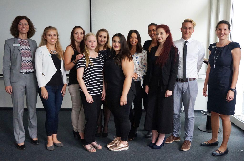 Foto: Ein Teil der diesjährigen Absolventen – die anderen sind im Urlaub - mit Personalchefin Nicola Merkle (rechts) und der stellvertretenden AOK-Geschäftsführerin Heike Kallfass (links)