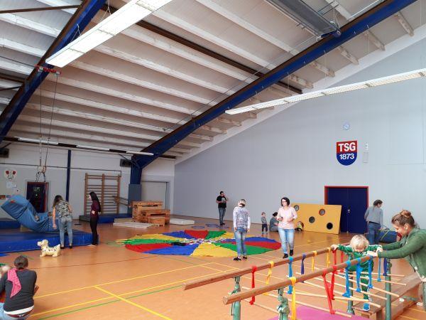 Am Morgen des 25.09.2017 wuselte es mal wieder im Sportzentrum der TSG. Der Familientreff Eislingen war zu Gast bei der KiSS. 12 Eltern mit Kindern turnten durch die Halle und erforschten die verschiedensten Stationen. Nach einer kurzen Vorstellungsrunde waren die Kleinsten nicht mehr zu bremsen und wollten den Bewegungsparcours erkunden. Zusammen mit Mama und Papa wurde die Sprossenwand erklommen, mit dem Bobby Car durch Tunnel gefahren und wackelige Hängebrücken überquert. Zum Abschied wurde noch eine Runde gesungen bis sich alle Kinder erschöpft und hungrig wieder verabschiedeten. |