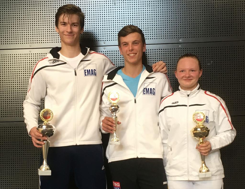Bei den Jungs sorgte Frederic Kindler für die Bestätigung seines Favoritenstatus. Souverän gelang er in die Runde der letzten 8. Hier schlug er zunächst Lars Benedikt Köck aus Dormagen mit 15:9 und distanzierte im folgenden Halbfinale den Tauberbischofsheimer Sebastian Blatz mit 15:10. Im erwarteten Finale traf er dann auf den Dormagener Raoul Bonah. Beide hatten schon in Dortmund vor Saisonende im Finale gestanden. Bis zum Schluss konnte keiner der beiden eindeutig die Oberhand gewinnen. Beim Stand 14:14 hatte Frederic dann leider kein Glück, knapp verpasste der die Parade und Bonah konnte seinen Angriff unterbringen. Damit ging im Gegensatz zum Finale in Dortmund diesmal „nur“ die Silbermedaille in Frederics Sammlung. Nur knapp am Finale vorbeigeschrammt war Ralph Rommelspacher. Über einen kleinen Umweg im Hoffnungslauf sicherte auch er sich den Einzug in die letzten 8. Hier stand er nun Louis Haag vom FC Tauberbischofsheim gegenüber. Obwohl Haag es war der Ralph zuvor in den Hoffnungslauf gebracht hatte, agierte er nun souverän und lies sich den Einzug ins Halbfinale nicht nehmen. Dort stand dann leider Raoul Bonah im Weg. Trotz starker Aktionen konnte Ralph dieses Gefecht nicht für sich entscheiden landete auf Rang 3.