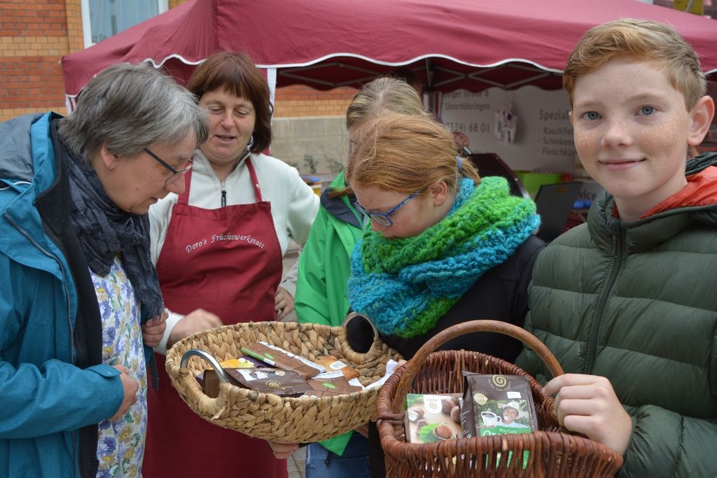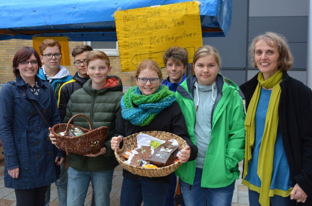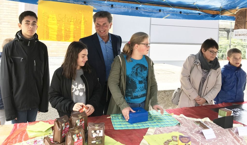 „Möchten sie faire Schokolade probieren? Diese Schokolade hilft, dass Kinder nicht arbeiten müssen, sondern in die Schule gehen können!“ Die Lehrer staunten nicht schlecht über das Engagement ihrer Schüler und kaum ein Marktbesucher konnte dem Charme und der Überzeugungskraft der Jugendlichen widerstehen. Selbst Oberbürgermeister Klaus Heininger und Schulleiter Stephan Arnold schauten vorbei und deckten sich bei einem ausgiebigen Einkauf mit ihren Lieblingssorten ein. In drei Stunden verkauften die Siebtklässler an ihrem Marktstand 130 Tafeln Schokolade sowie Kaffeebohnen und Mangostreifen. Zuvor hatten sie gemeinsam über das beste Marketing und über die Verkaufspreise diskutiert. Die Strategie der Jugendlichen ging auf: Am Ende des Vormittags waren alle mitgebrachten Waren im Wert von 270 € verkauft.