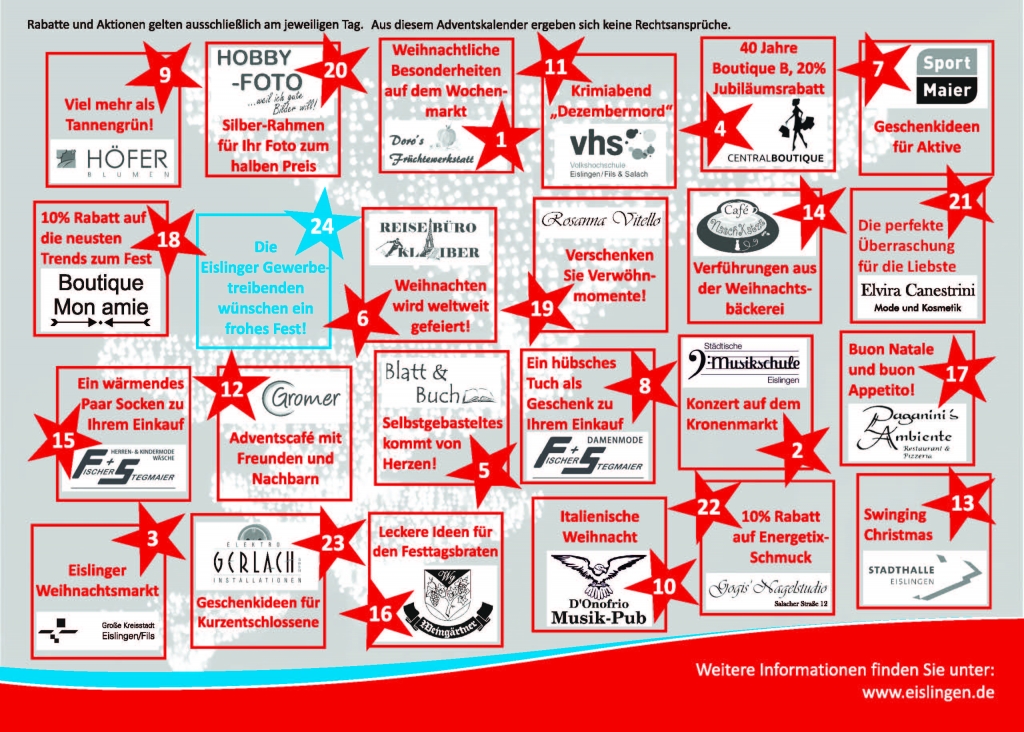 24 besondere Angebote an 24 Adventstagen – alles nur einen kurzen Spaziergang von zuhause entfernt. Damit locken das Eislinger Stadtmarketing und der Verein der Eislinger Selbstständigen in der Vorweihnachtszeit. Das Besondere: Die Geschäfte selbst sind die „Türchen“ und die Kunden erwartet täglich hinter einem anderen Schaufenster eine weihnachtliche Überraschung mit kleinen Geschenken, Rabatten oder besonderem Beratungsservice.