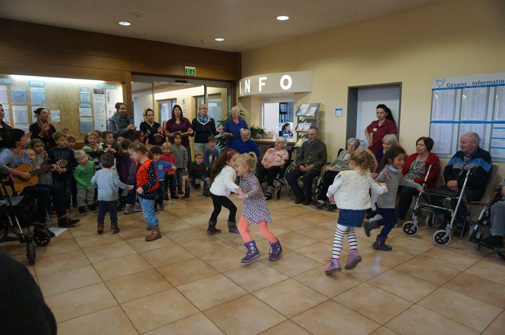 Im Anschluss wurden die Gottesdienstbesucher im Atrium mit einem Sektempfang begrüßt. Das Kinderhaus St. Michael war ins Altenzentrum St. Elisabeth eingeladen um die Feier mit fröhlichen Liedern zu umrahmen. Mit einem Begrüßungslied sagten die Kinder „Hallo“ und animierten die Bewohnerinnen und Bewohner zum Mitmachen. Athina Andreadou, Kundenberatung bedankte sich bei den Kindern und Erzieherinnen für den unterhaltsamen Beitrag und die gute Zusammenarbeit.