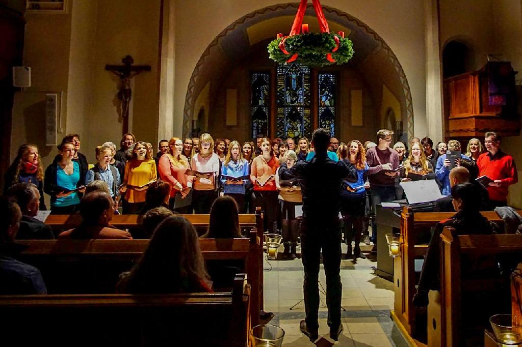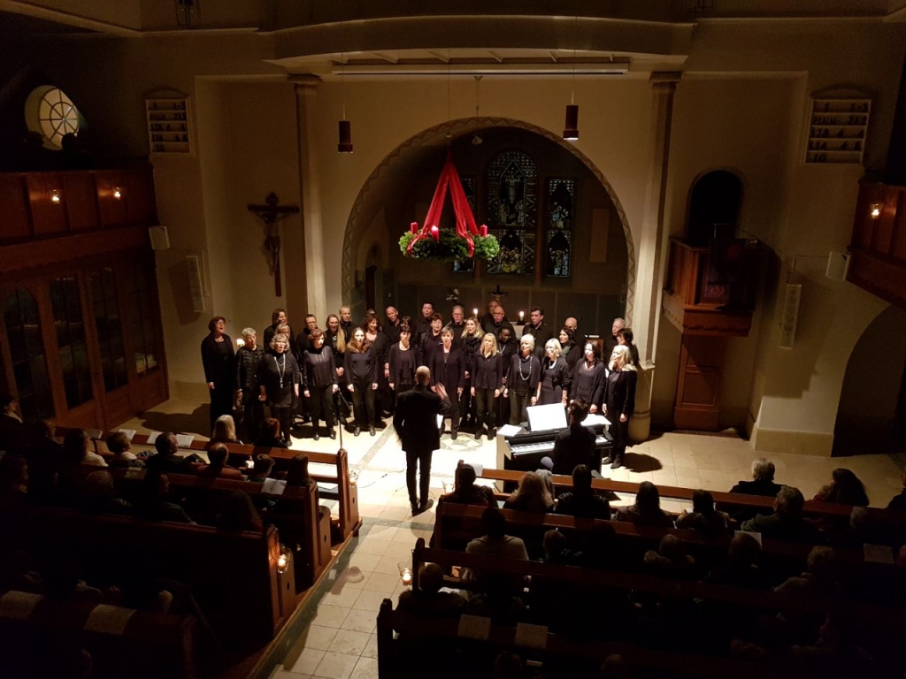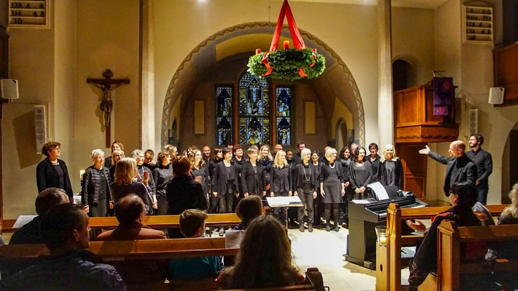 Das Konzert war im besten Sinn vielfältig und bunt und glich einer musikalischen Reise durch verschiedene Länder. Zum Einzug in die Kirche erklang das nahezu engelsgleiche Traditional „Evening rise“, das der Chor gekonnt intonierte und auch beim anschließenden Südtiroler Mettenjodler bewies, dass er bei acapella-Stücken sehr sicher aufgestellt ist. Christof Eßwein, seit dem Frühjahr verantwortlich als akribisch arbeitender Chorleiter für Salto Vocale, hatte im Anschluss eher klassische Stücke gesetzt: „Oh Heiland, reiß die Himmel auf“ (aus dem 17. Jahrhundert) und „Leise rieselt der Schnee“, neu und überraschend anders arrangiert. Mit dem südafrikanischen Traditional „Mashiti“ leitete Salto Vocale über zu Stücken, die amerikanische Wurzeln haben: Rudolph, das Rentier mit der roten Nase, wirbelte – in bester Weise am Piano getragen von Michael Hauser – ebenso durch die Lutherkirche, wie der aus den 1950er stammende Snowman „Frosty“ und der rot bemützte „Mister Santa“. An diese Tradition knüpfte – als Überraschung des Konzertabends – auch der „Junge Chor“ des Eislinger Liederkranzes an: sie beeindruckten bei ihrem allerersten öffentlichen Auftritt mit ihrem Dirigenten Daniel Schmid die Gäste mit „Seasons of Love“ aus dem Broadway Musical „Rent“ und dem gekonnt vorgetragenen „Celtic Carol“. Die weihnachtliche Fassung von „Highland cathedral“ (in ihrem Ursprung gar als schottische Nationalhymne vorgeschlagen) erfüllte danach vierstimmig und voluminös die Lutherkirche. Eine besonders beeindruckende Harmonie boten die Sänger von Salto Vocale bei „Only time“ von Enya, einem Stück, das nach den 9-11-Terroranschlägen eher traurige Berühmtheit erlangt hatte. Das Schlussviertel des sehr abwechslungsreichen Adventskonzertes leitete der Chor im Wechsel mit den Besuchern mit „Macht hoch die Tür“ ein und ging über in das kraftvolle „Baba Yetu“ , dem Vater unser in der ostafrikanischen Suaheli-Sprache. Besonders stimmungsvoll, weil auf den Punkt genau von Christof Eßwein gesetzt und von Salto Vocale hervorragend gemeistert, der deutsche Kanon „Heimat, irgendwann“ und „O du stille Zeit“ nach Joseph von Eichendorff.