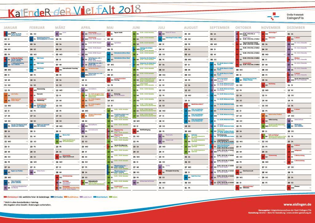 Jede Nation, jede Kultur hat ihre eigenen weltlichen und religiösen Traditionen, Gebräuche und Feste. Auch diese machen das Leben in Eislingen vielfältiger und bunter. Christentum, Islam, Judentum, der Buddhismus und der Hinduismus, die fünf Weltreligionen, spiegeln die Vielfalt der Religionen wieder. Der „Kalender der Vielfalt“ der Stadt Eislingen zeigt den Reichtum an Feier- und Gedenktagen verschiedener Religionen und Kulturen, die in Deutschland und auch in Eislingen gemeinsam leben. Er soll dazu dienen, Menschen aus verschiedensten Religionen miteinander ins Gespräch zu bringen. So können sich Christen, Juden, Muslime, Hinduisten und Buddhisten gegenseitig zu Feiertagen gratulieren und gleichzeitig deren Bedeutung kennenlernen.