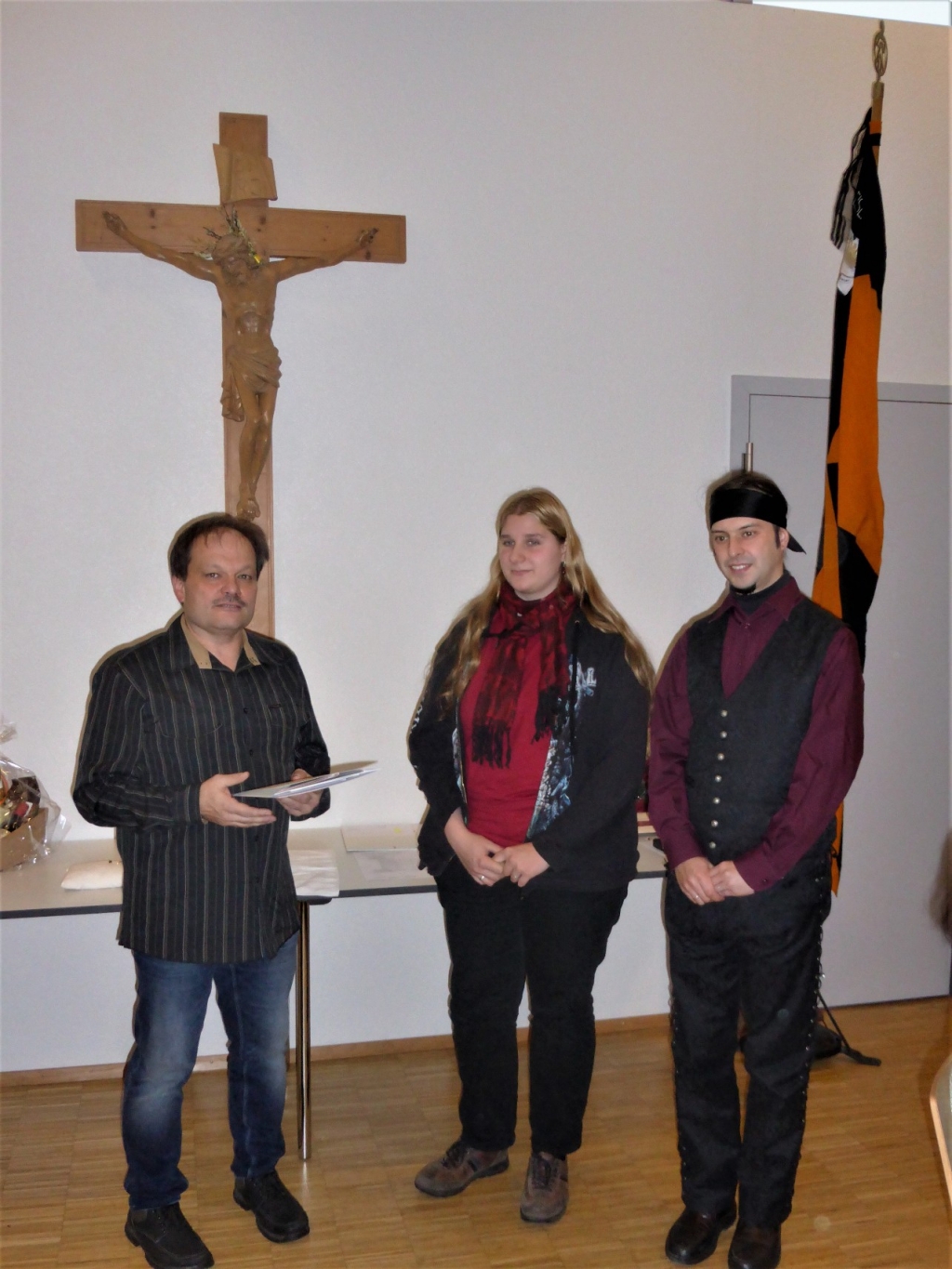 Am Sonntag feierte die Kolpingsfamilie Eislingen den Kolpinggedenktag. Nach der gut besuchten Heiligen Messe in der St. Markuskirche ging das Fest im nahen Gemeindezentrum in die 2. Runde. Umrahmt von den Klängen des Zupforchesters wurden die Ehrungen und Neuaufnahmen durchgeführt. Geehrt wurden: Für 25 Jahre Mitgliedschaft Edith Herrlinger, für 40 Jahre Margret Hild, für 60 Jahre Georg Meyerle und Siegfried Riedmüller, für 65 Jahre Siegfried Hollnaicher, Walter Kölle und Eugen Matt. Neu in die Kolpingsfamilie aufgenommen wurde das Ehepaar Anke und Frank Groß. Nach dem schmackhaften Mittagessen an den festlich geschmückten Tischen gab es gute Gespräche auch mit Barbara und Ignaz Zachay die aus dem Oberland angereist waren. Siegfried Hollnaicher, Martin und Simon Dworak, Eugen Matt (65 J.) |