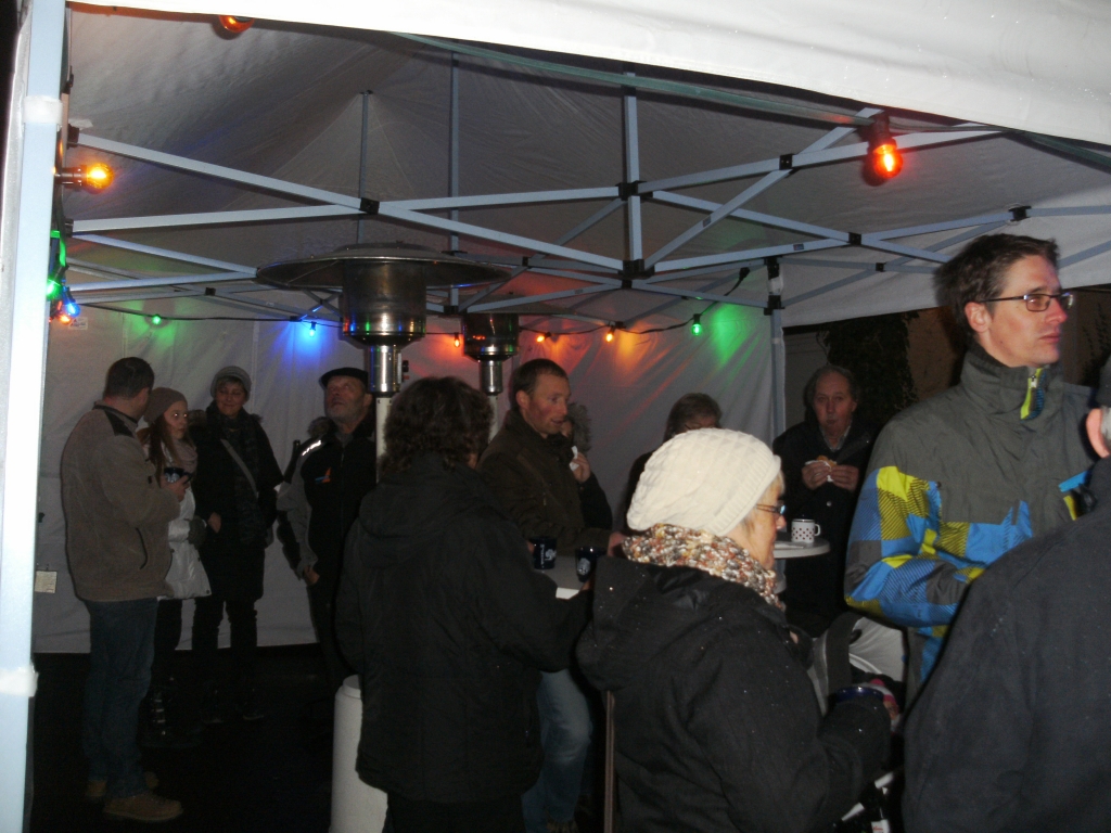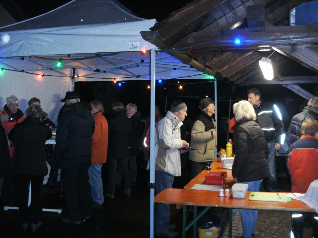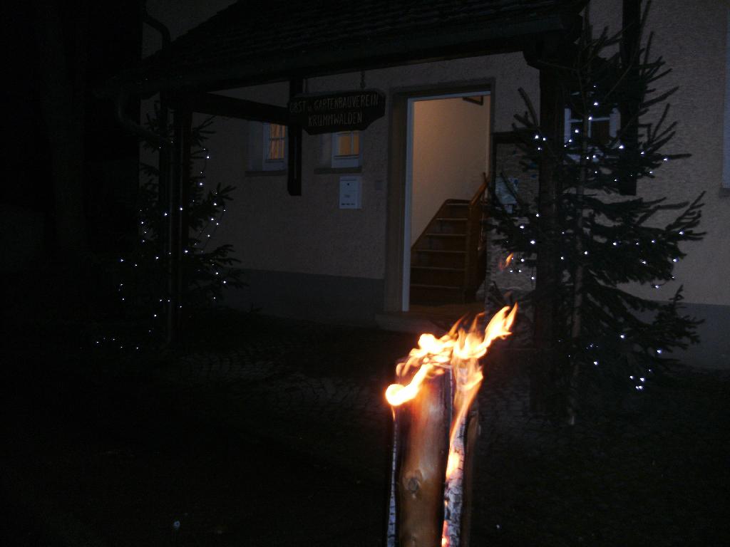 Brennende Schwedenfeuer zeigten am Samstag, 16.12.2017 den Weg zum Adventsfeuer des OGV Krummwälden. Im Hof beim Dorfgemeinschaftshaus konnten sich die Besucher stärken, wärmende Getränke genießen und sich an den Stehtischen gemütlich unterhalten. |