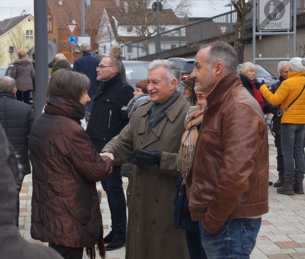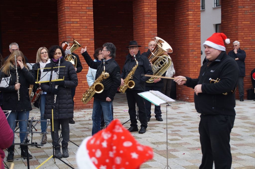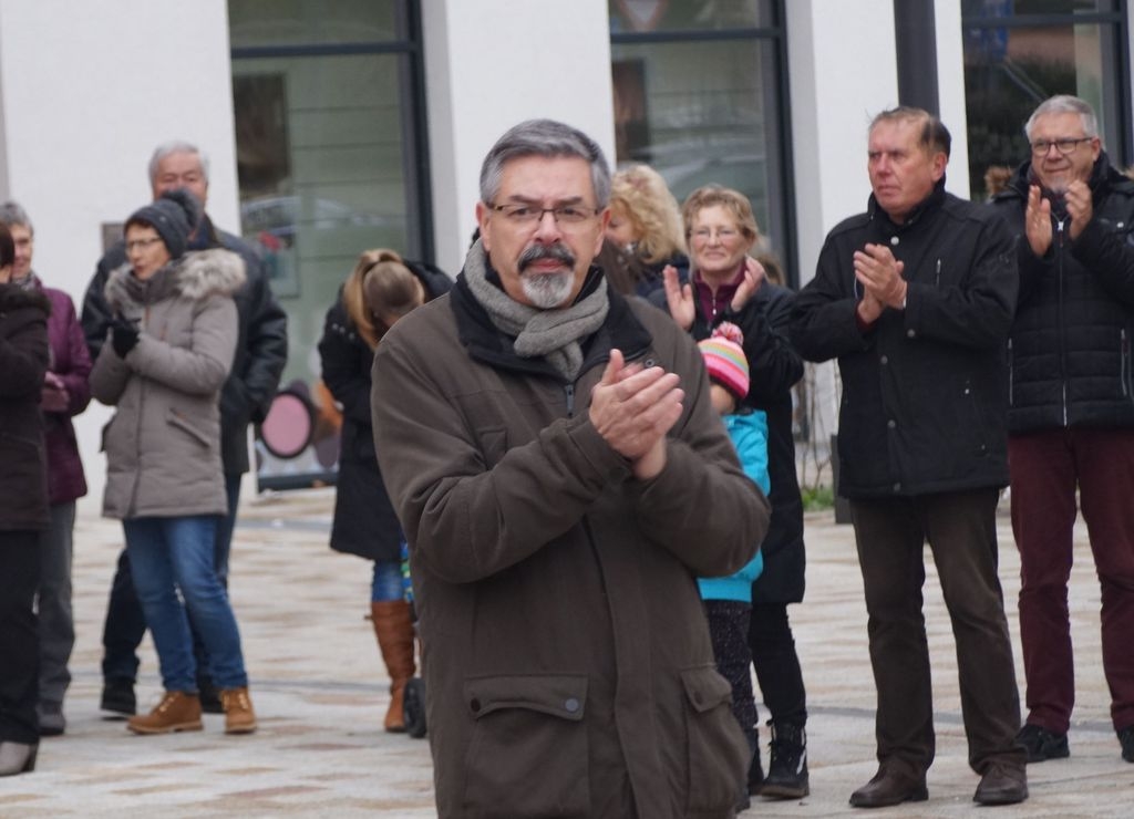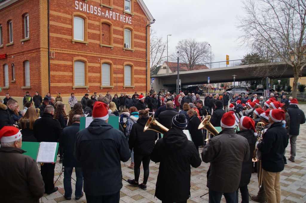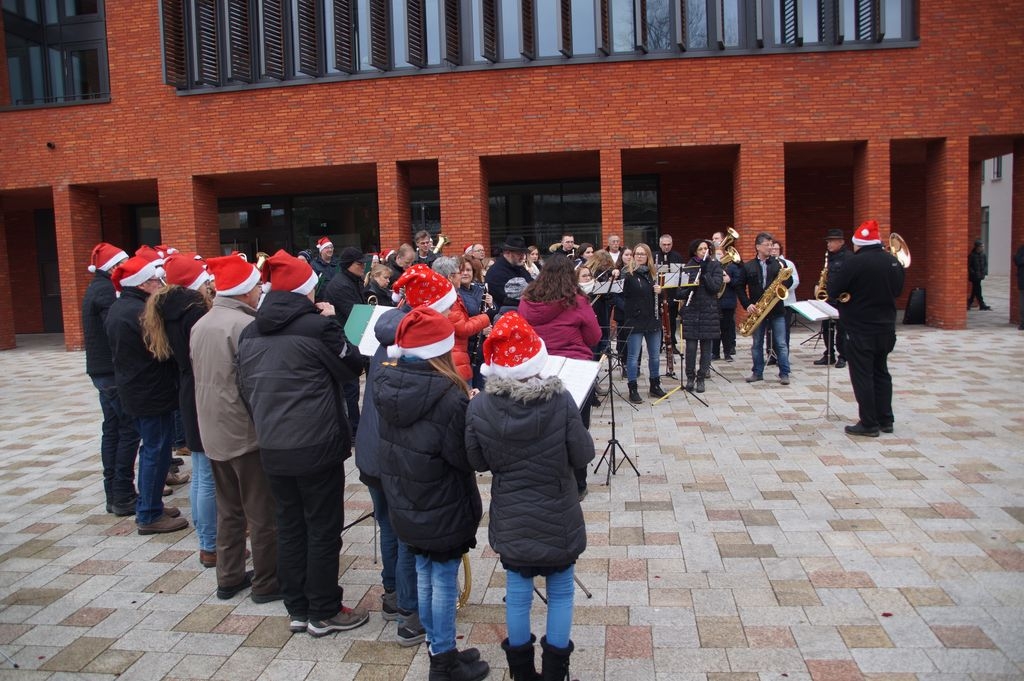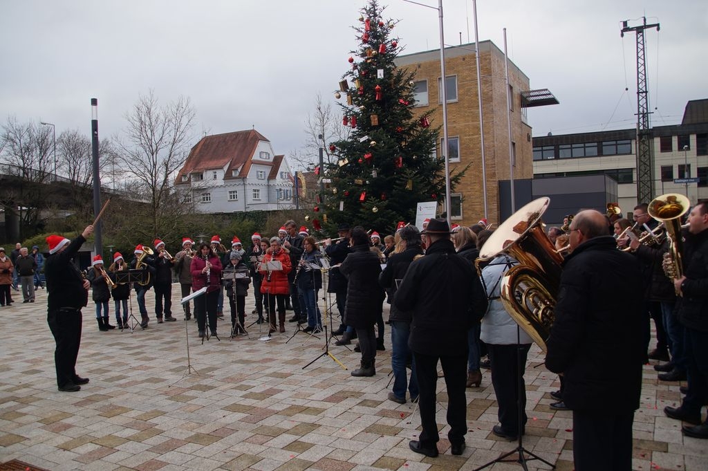 Zum ersten Mal trafen die Eislinger Stadtkapelle und der Posauenchor des evangelischen Jugendwerks bei ihrem musikalischen Rundgang durch Eislingen pünktlich um 14 Uhr gemeinsam am neuen Rathaus ein, um dort vor einer großen Zuhörerschar weihnachtliche Lieder anzustimmen. |