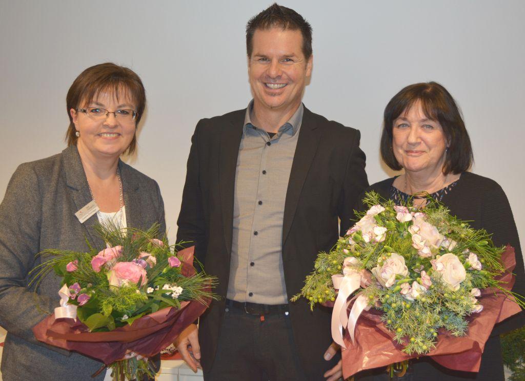 Mit einem großen Blumenstrauß verabschiedete Bürgermeister Jürgen Gröger (Bildmitte) seine Sekretärin Renate Bühler-Schleicher (re.). Die Nach- folge tritt Susanne Öhlschläger (li.) an
