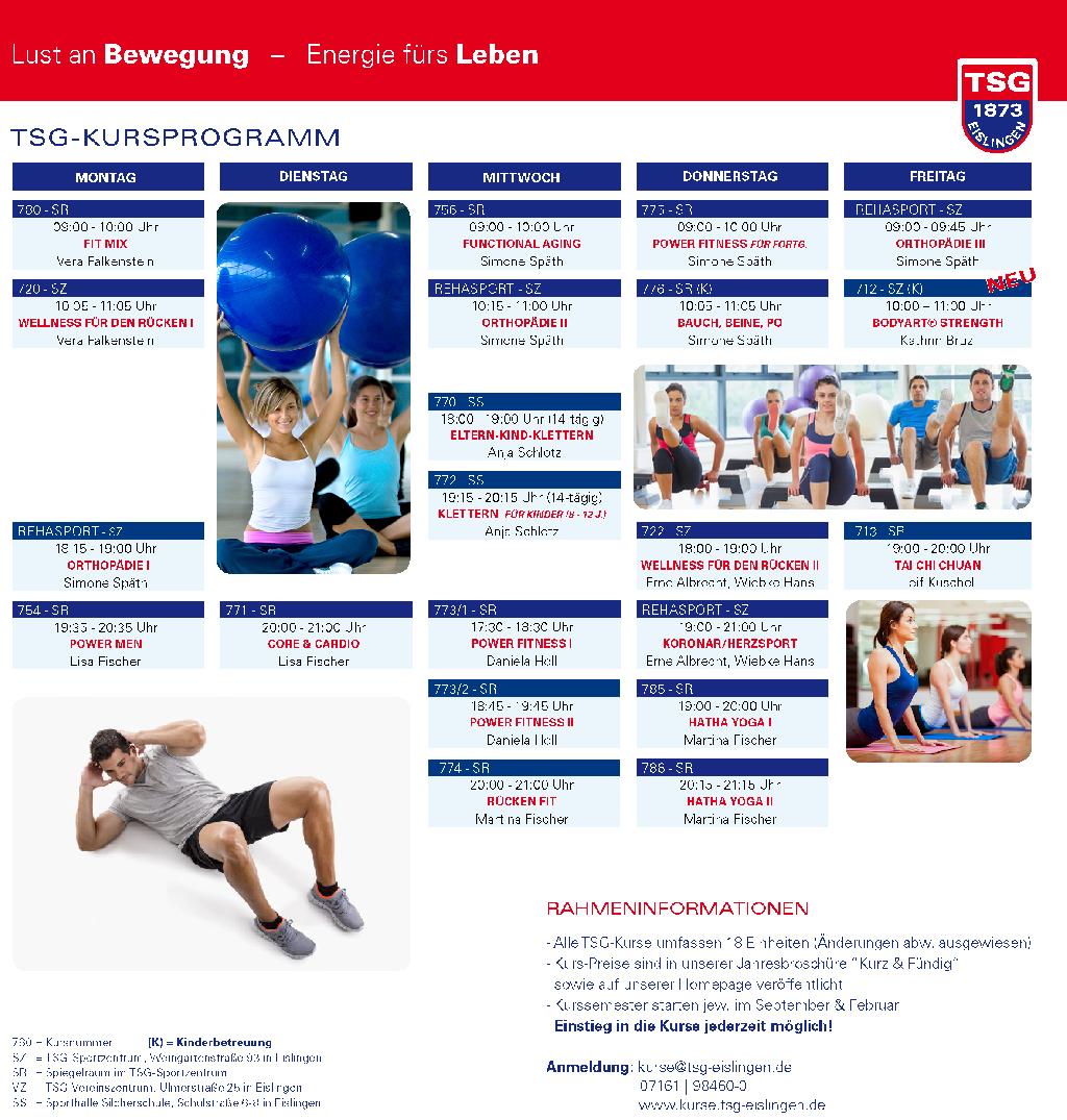 Die Fitness- und Gesundheitskurse der TSG starten ab dem 19.02.2018 in das neue Semester. Um uns und unsere Kurse vorab kennenzulernen, bieten wir vom 29.01.-09.02.2018 Schnupperwochen an, in denen Sie unverbindlich und kostenlos in jeden Kurs reinschnuppern und mitmachen können. Es ist nie zu spät ihre guten Vorsätze anzugehen und etwas für ihre Fitness und Gesundheit zu tun! Kursplan 2018 |