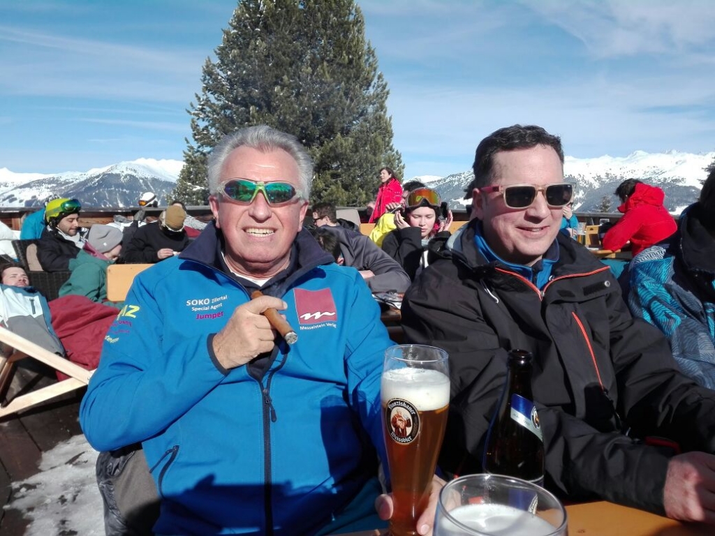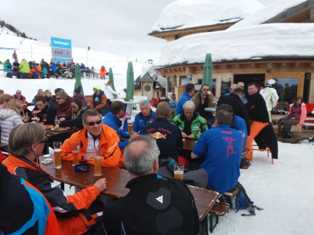 Danach zog es uns ins Hiatamadl zum stimmungsvollen Apres. Am Abend verwöhnten uns Udo und Eri mit einer Maultaschenkreation die wohl Richtung Sternekategorie ging. Samstag ging es erneut zum Penken und auch dieser Skitag sollte wieder das ein oder andere Highlight bringen. Erst wurden wieder sämtliche Pisten abgefahren zum Mittag suchten wir dann unsere Stammhütte auf. Als uns dann Christian der Wirt der Grillhof-Alm mit einem Vesperbrett der Extraklasse überraschte und es auch noch zu schneien begann, zogen wir geselliges Beisammensein mit einem Binokel dem schlechten Wetter vor. Bei der abschließenden Abfahrt gab es einmaliges zu bestaunen nämlich den ersten 'Drogen-Baron' auf Skiern. Beim anschließendem Flüssigkeitsverlust-Ausgleich im Hiatamadl sowie der Postalm ließen wir es nochmals krachen. Beim Zwischenstopp an der Wohnung wurde beim Restekochen von dem ein oder anderen Beikoch allerlei Variationen und Kreationen gezaubert. Vom ein oder anderen wurde dann nochmals die Postalm angesteuert. Die Spätheimkehrer waren dann sehr verantwortungsbewusst und haben in den Zimmern nachgeschaut ob auch alle Kameraden zu Hause sind und niemand irgendwo vergessen wurde. Sonntag fuhren wir dann nochmals in Kaltenbach bei etwas diffusem Licht und den anstrengenden Skitagen und Abenden in den Beinen gingen wir es aber nur etwas gemütlicher an. Beim Abschlussgetränk auf der Terrasse des Sängerheims konnten wir sogar nochmals die Sonne genießen. So gingen 4 sehr schöne Skitage für uns alle verletzungsfrei wieder mal etwas zu schnell zu Ende. Zum Schluss gilt es für uns Danke zu sagen erstmal an Frau Mändle und Maultäschles-Wirt Scheffi bei der Verkostung - bei Frau Mändle für die wie immer wunderbare Sauce Bolognese für ihre Jungs und bei Scheffi für seine legendären, superleckeren Maultaschen. Weiterer Dank gilt unserm Präsi Jumper für die wie immer perfekte Organisation unserem Küchenteam Udo und Eri sowie den diversen Kochhilfen die mit leckeren Gerichten dafür gesorgt haben, dass wir zu keiner Tages- oder Nachtzeit hungern mussten. Unserem Manne gilt noch der Dank für die Wurstdosenspende die auch noch für einige Kabinenvesper reichen wird und somit auch die AH´ler was davon haben die diese tolle Skiausfahrt verpasst haben. Fazit von uns allen: es waren mal wieder supertolle, stimmungsvolle, harmonische Tage - wir freuen uns jetzt schon auf die Skiausfahrt 2019.