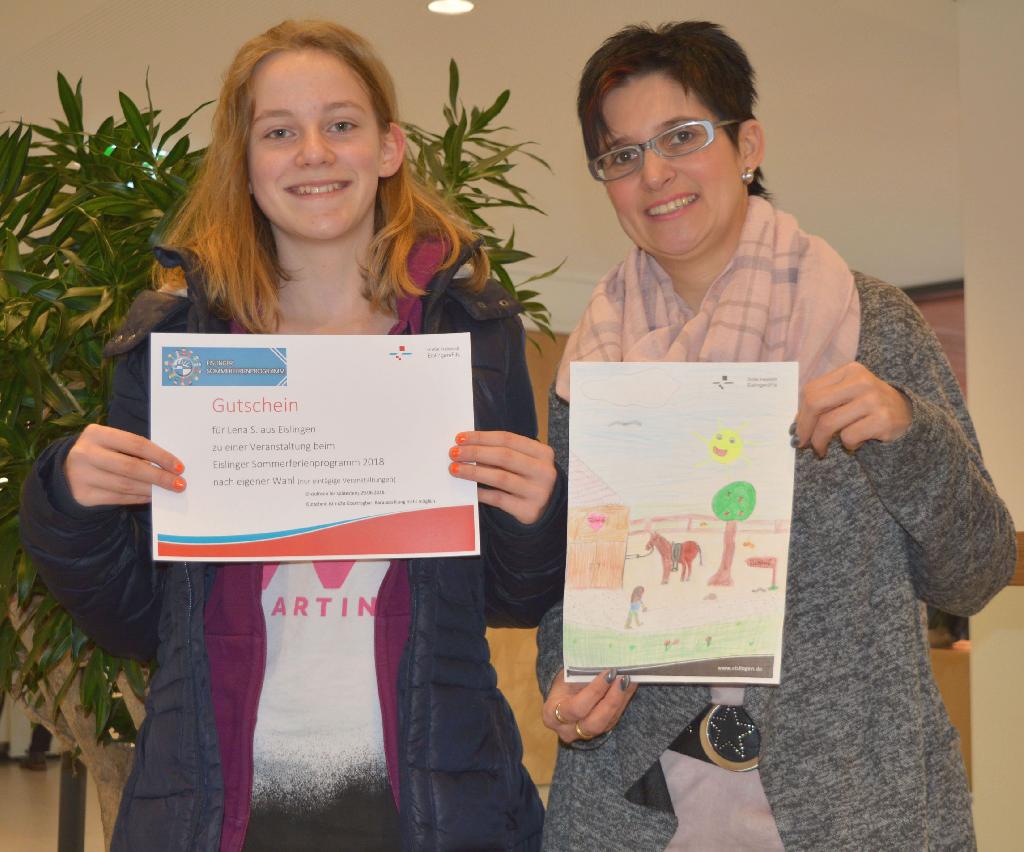 Strahlende Gesichter bei der Preisübergabe im Rathaus. Gewinnerin Lena (links) freut sich mit Sandra Fetzer (rechts) über ihren Gutschein.