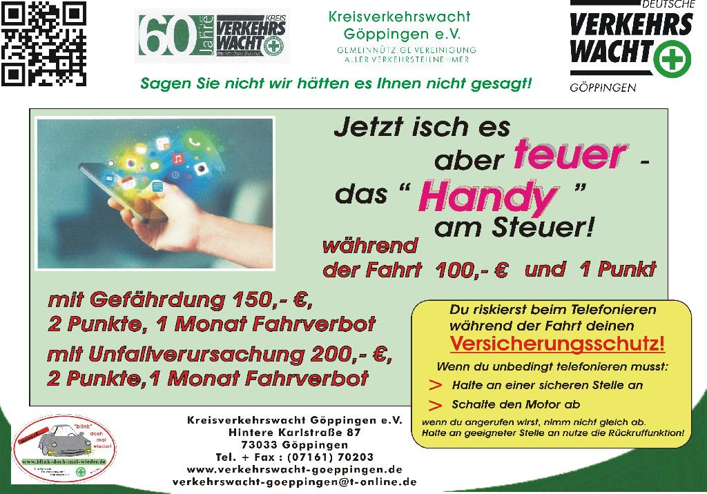 Diesen Themenbereich hat nun die Kreisverkehrswacht Göppingen e.V. zum Jahresthema 2018 bestimmt. Mit einem neu gestalteten Flyer möchte die gemeinnützige Institution einen Beitrag leisten, die betroffenen anzusprechen. Der Flyer beinhaltet wichtige Informationen zum Thema. Es werden die Bußgeldsummen und Punkte bei den unterschiedlichen Situationen, bis hin zum Versicherungsverlust dargestellt. So wird deutlich, dass ein Bußgeld von 100,- € und 1 Punkt in der Verkehrssünderkartei fällig wird, wenn man mit so einem Ding am Steuer erwischt wird. Die Zuschläge bei Gefährdung belaufen sich auf 150,-€, 2 Punkte und einen Monat Fahrverbot. Bei Unfallverursachung sind bereits 200,- €, 2 Punkte und ein Monat Fahrverbot fällig.