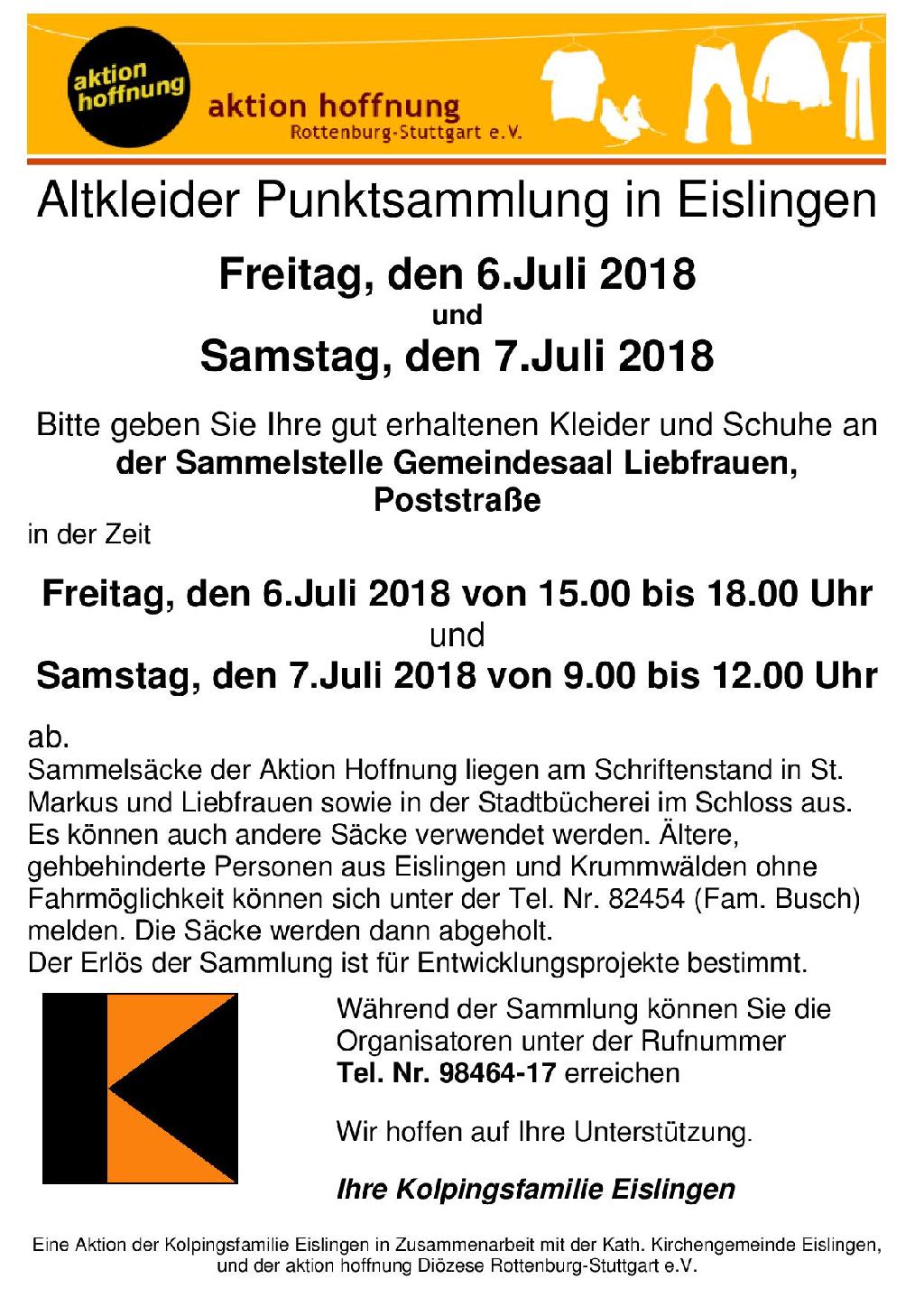 Sammelsäcke der Aktion Hoffnung liegen am Schriftenstand in St. Markus und Liebfrauen sowie in der Stadtbücherei im Schloss aus. Es können auch andere Säcke verwendet werden. Ältere, gehbehinderte Personen aus Eislingen und Krummwälden ohne Fahrmöglichkeit können sich unter der Tel. Nr. 82454 (Fam. Busch) melden. Die Säcke werden dann abgeholt.