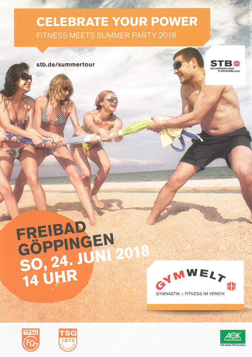 Die beiden Vereine laden am Sonntag, den 24.06.2018 von 14:00 – 17:00 Uhr gemeinsam zur GYMWELT-SummerTour ins Göppinger Freibad ein. Die Besucher erwartet ein abwechslungsreiches und aktives Programm: