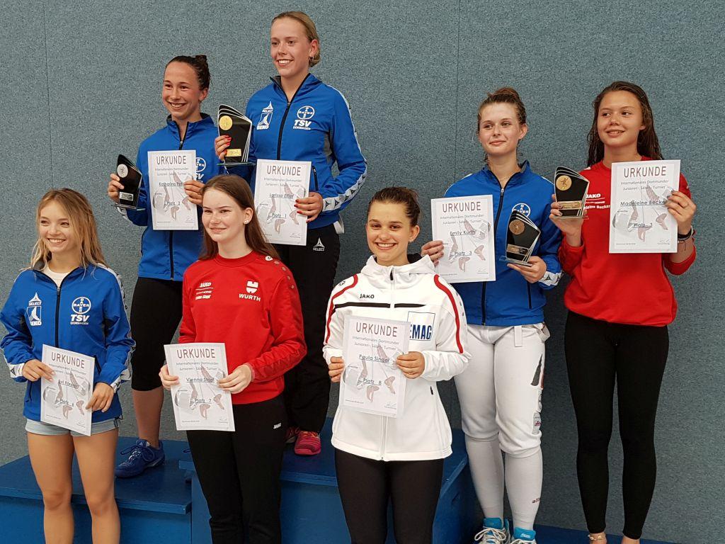 Bei den Damen konnte Paula Singer das beste Ergebnis erzielen. Sie kämpfte sich bis ins Viertelfinale vor, musste sich dort aber der späteren Turniersiegerin Larissa Eifler geschlagen geben und erreichte einen guten 8. Platz. Shannen Kuhn traf eine Runde zuvor auf Vereinskollegin Paula Singer und verlor das Gefecht 8:15, sie erreichte Platz 9. Anette Kramer und Lea Hartmann mussten sich mit den Plätzen 14 und 16 zufriedengeben. Sie unterlagen Beide im Hoffnungslauf (13-16) den Konkurrentinnen Madeleine Becker (Künzelsau) und Emily Kurth (Dormagen) mit 10:15 und 7:15. Weitere Plätze: 19. Vivien Buchmann, 34. Celina Treffkorn, 46 Violetta Kramer, 51. Inga Von Buch.