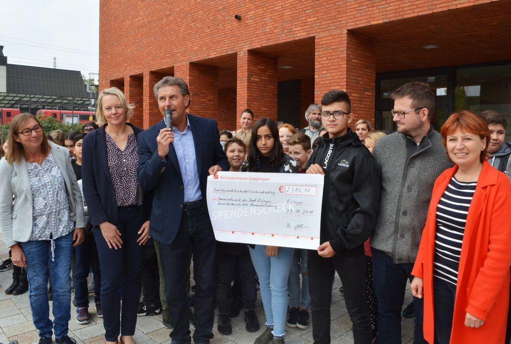 Ein Tandem-Fahrrad, das in der Fachsprache auch unter Duo Dreirad läuft und für den Abschluss der Aktion von der Firma Alb-Store zur Verfügung gestellt wurde. Das Fahrrad bietet eine sichere und bequeme Möglichkeit, um Menschen mit einem Handycap oder Senioren eine Tandemfahrt in Begleitung zu unternehmen. „Eine ganz tolle Sache, um Jung und Alt zusammenzubringen“, ist sich der stellvertretende Schulleiter der Silcherschule, Andreas Eiglmaier, sicher. Dass das langjährige Schulprojekt ein Erfolgsmodell ist, beweist allein schon die lange Laufzeit. „Die Aktion geht jetzt ins 14. Jahr und jedes Mal ziehen alle wieder auf’s Neue mit an einem Strang“, lobte er das gesamte Organisationsteam und das ungebrochene Engagement seiner Schüler. Als starke Leistung bezeichnete er das Spendenergebnis, für das seine Schützlinge einen Tag lang kräftig „in die Hände gespuckt“ und gearbeitet haben. Freuen durften sich aber vor allem Heide Daiss und Hannelore Schnitzler, als die beiden Schülersprecher Daniel Moses und Rohat Soleiman den übergroßen Spendenscheck symbolisch überreichten. Mit dem Geld können wir jetzt endlich den Startschuss für die Anschaffung des Tandems in Angriff nehmen. Generationenverbindend stellen wir uns den Einsatz vor“, bekräftigten beide freudenstrahlend. Allein schon der Name „Fun2Go“ verspricht Spaß und gute Laune bei einer Spazierfahrt durch Eislingen oder in die nähere Umgebung. Bis zur endgültigen Finanzierung ist es aber noch ein weiter Weg. Ingrid Held, Religionspädagogin an der Silcherschule warb bei dieser Gelegenheit aktiv um weitere Mitstreiter, um möglichst zeitnah den Anschaffungspreis in Höhe von 8.600 Euro aufzubringen. „Wir brauchen dringend noch Unterstützer, um die Restfinanzierung zu schultern.“ Auf offene Ohren stieß sie bei Oberbürgermeister Klaus Heininger, der den Ball sofort aufnahm und versprach, finanziell mit unter die Arme zu greifen. „Ich bin hin und weg von der Tatsache, wie viel Schüler hier mitgewirkt haben“. Überzeugt war das Stadtoberhaupt vom Nutzen des Tandems, mit dem man vielen Menschen eine Freude machen könne. „Wir stocken auf!“, sicherte er zu. Es solle keinesfalls an der Stadt Eislingen scheitern, wenn es darum ginge, Menschen mobil zu halten und ihnen das Gefühl zu vermitteln, nicht ausgegrenzt zu sein, bekräftigte er seine Zusage. Mit der Aktion Ehrensache sei es vorbildlich gelungen, Menschen im gesellschaftlichen Mittelpunkt zu halten, sagte er in seinem Dank an alle Beteiligten.
