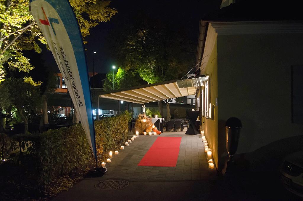 Zu Beginn wurde auf der Terrasse des Marstalls ein Sektempfang geboten. Das Vorspeisenbüffet war beim Eintreffen der Gäste an der Wand des hinteren Raumes aufgebaut.