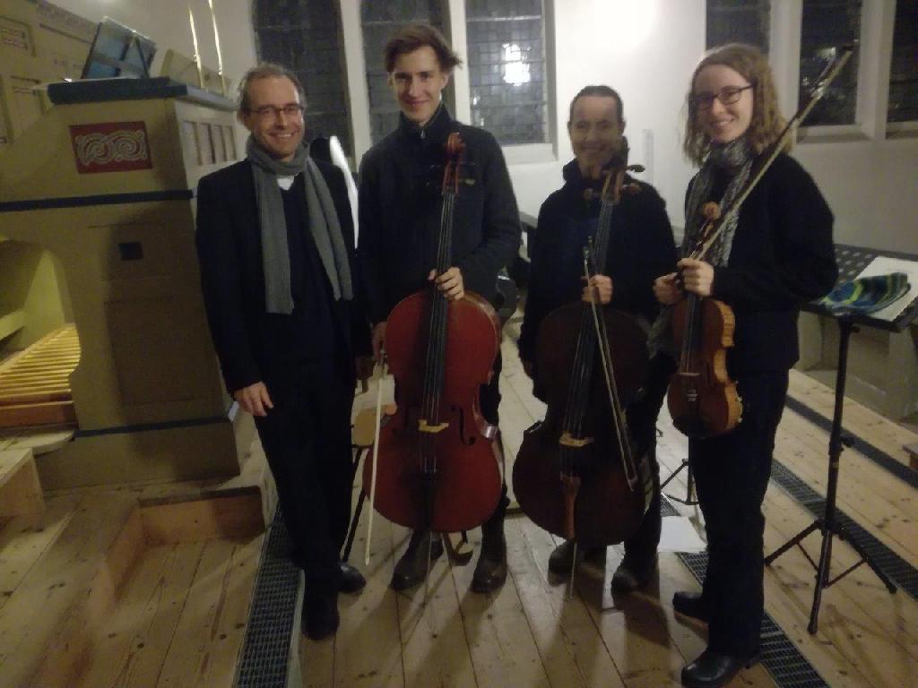 Den musikalischen Beitrag verwirklichte aufs Beste die hochmusikalische – und in Europa weitgereiste und vielfach ausgezeichnete – Familie Rückschloß: Vater Rainer Maria mit seiner Frau Uta Barbara Schwenk-Rückschloß und dazu die beiden – mittlerweile erwachsenen – Kinder Ada Aria und Ead Anner mit ihren Instrumenten Orgel bzw. Basso continuo, Violoncelli (gespielt von Mutter Uta Barbara und Sohn Ead) und Ada mit hochausdrucksvollem Violin-(Solo-)spiel.