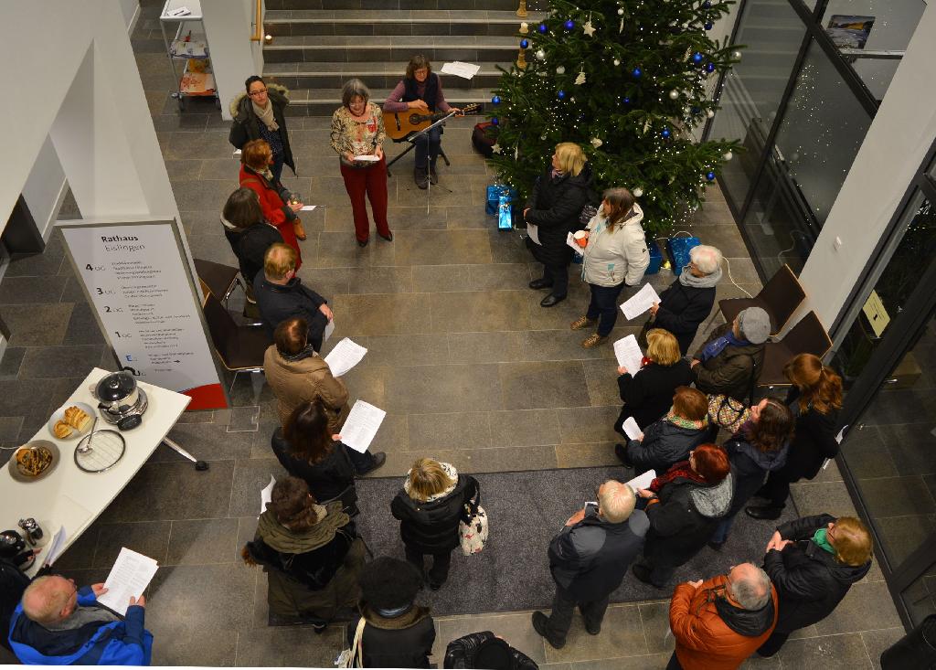 Auf dem Schlossplatz wehte ein kalter Wind aber im warmen Foyer zauberte der Lebendige Adventskalender vor den großen Sitzstufen ein warmes und vorweihnachtliches Ambiente. Rund 30 Bürgerinnen und Bürger folgten der Einladung und versammelten sich vor dem festlich geschmückten Weihnachtsbaum , der eine weihnachtlich glänzende Kulisse bot. Die Leiterin des Bildungs-, Kultur- und Sportamtens,