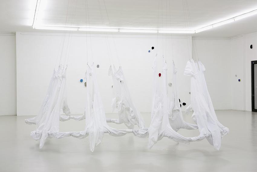 Die weiße Skulptur: Reinhold Engberding, „fittings 69“, 24 alte weiße Herrenhemden genäht, PVC-Rohre, Kordel, 2015