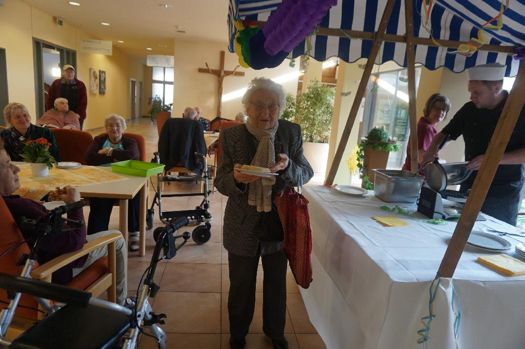 Der Duft von frischen Waffeln verströmte noch Stunden später einen angenehmen Geruch im Atrium und ließ auf einen Nachmittag mit vielen Leckereien schließen. Christian Lehmann, Koch im Altenzentrum St. Elisabeth begrüßte die vorbeigehenden Bewohner und Besucher. „Das ist heute eine süße Überraschung zum Kaffee, anstatt Kuchen“ schwärmt Valentina Horvat und lässt sich die frisch gebackene, noch warme Waffel schmecken. Ob mit Puderzucker oder Apfelmus, es war für jede Geschmacksrichtung etwas dabei.