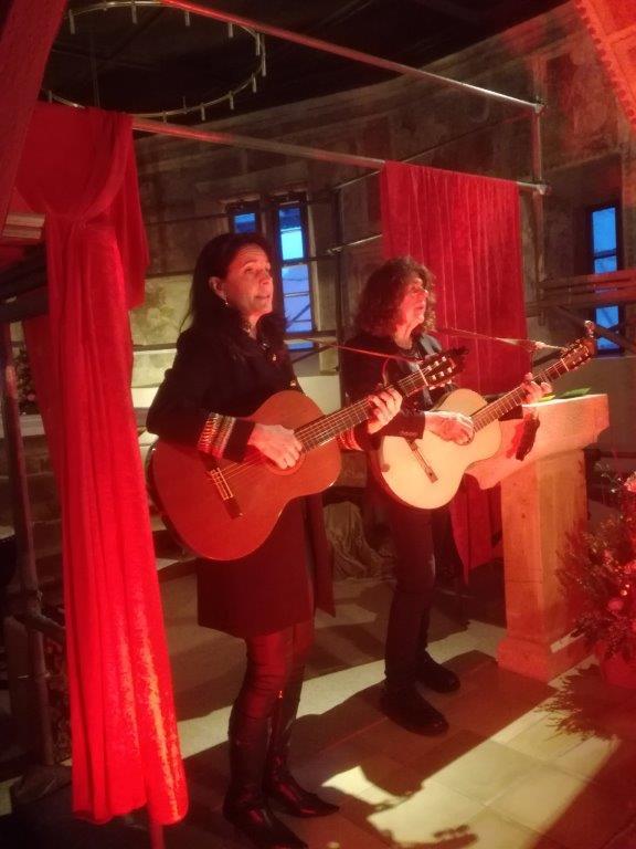 Harald Immig, der „Liedpoet“ vom Hohenstaufen und die Sängerin und Gitarristin Ute Wolf (in Abänderung des angekündigten Programms mit dem geplanten Auftritt des Meisters auf der Mandoline und Lyra, Klaus Wuckelt, der leider absagen musste) zogen die Konzertbesucherinnen und –besucher von Anfang an in ihren Bann: Harald Immig mit seinem schönen Bariton und Ute Wolf mit ihrer weichen Sopran-Stimme. Sie wurden der Ankündigung im Programm „Es erwartet Sie die ganze Bandbreite lyrischer und stimmungsvoller Musik“ voll gerecht. Natürlich ist die „ganze Bandbreite“ dieser Musik metrisch und zeitlich nicht definierbar, da diese sich bereits in den frühen Kulturen finden lässt und dann quer durch die Jahrhunderte. Man denke nur an musikalische Psalmvertonungen und auch epische Gesänge oder die Darbietungen der Minnesänger, auch nicht zu vergessen Bänkelsänger oder in neuerer Zeit „Liedermacher“ wie Bob Dylan, Stevie Wonder oder Reinhard Mey. Doch halt: In diesem konzertanten Rahmen muss die Kunst der Ausführenden begrenzt gesehen werden, da sie individuelles und gemeinsames Stil- und Ausdrucksmittel auf dem Felde des Poetisch-Musikalischen beinhaltet, also auch gesprochene Ankündigungen im Programmverlauf.