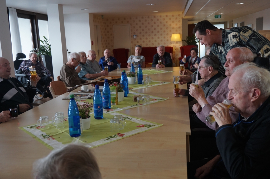 Am 23. April trafen sich, wie jeden Dienstag, die Herren des Altenzentrums St. Elisabeth im Gemeinschaftsraum des Wohnbereichs St. Martin, um gemeinsam einige schöne Stunden zu verbringen. Unter der Leitung von Reinhard Schulz genossen die Bewohner ihre kleine Auszeit von den geschwätzigen Damen des Hauses und widmeten sich bei einem kühlen Glas Bier oder Wein den wirklich interessanten Themen. Egal ob Politik, die neuesten Veränderungen in der Bundesliga oder ein paar nette Späßchen: Beim Männerstammtisch ist für jeden der Herren etwas geboten. Gerade für die Männer, welche sonst gerne von den vielen Frauen im Altenzentrum übertönt werden, ist der Männerstammtisch eine willkommene Gelegenheit um sich mit dem ein oder anderen Bekannten auszutauschen und zu lachen. Munter erzählten sich die Herren der Schöpfung Geschichten aus der Jugend und genossen es, für eine Weile unter sich zu sein. Ein besonderes Highlight stellte die musikalische Begleitung durch Reinhard Schulz und seiner Gitarre dar. Bei diversen Volksliedern ölte der ein oder andere seine Stimme und gemeinsam gaben unsere Männer so manches Liedchen zum Besten. |
