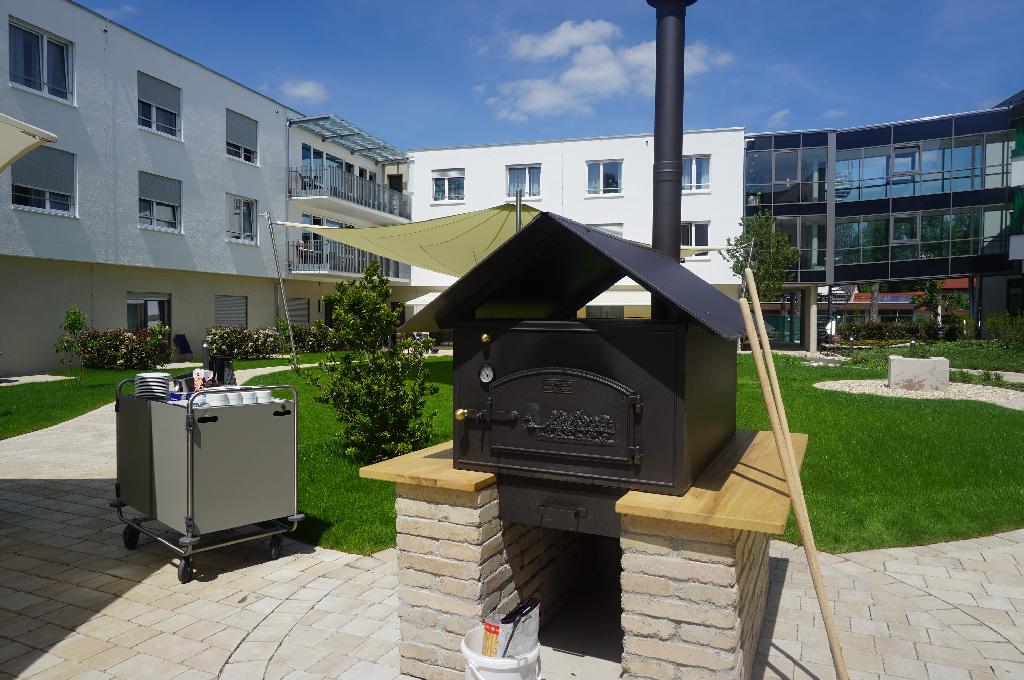 Am Donnerstagmittag zögerten die Tagespflegegäste und Mitarbeiterinnen der Tagespflegen St. Elisabeth und St. Franziskus nicht, um draußen im neu gestalteten Innenhof im Holzbackofen zu backen.