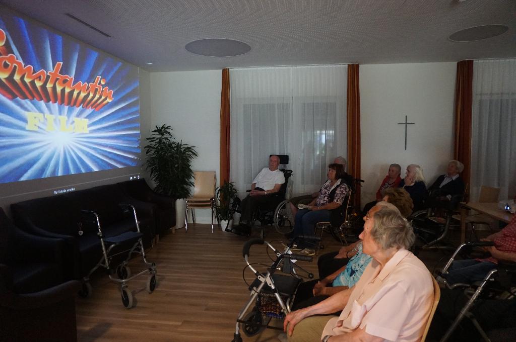 Am vergangenen Freitag wurde die Tagespflege St. Franziskus des Altenzentrums St. Elisabeth kurzerhand in ein Kino umgewandelt. Ab 15 Uhr konnten sich interessierte Bewohner im Gemeinschaftsraum der Tagespflege einfinden, um gemeinsam einen entspannten Filmnachmittag zu verbringen. Mit Hilfe eines Beamers konnte der Film an die Wand projiziert werden, wodurch echte Kinostimmung aufkam. Für viele Bewohner ist der letzte Kinobesuch schon eine Weile her, weshalb der Filmnachmittag ein echtes Highlight war. Lautsprecher und bequeme Stuhlreihen, die auch genügend Platz für Rollstuhlfahrer boten, komplettierten die Ausstattung.