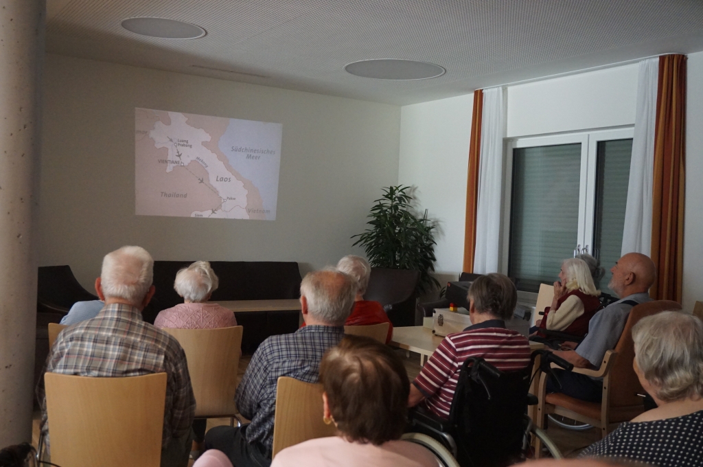 Am ersten Freitag im Juni lud das Altenzentrum St.Elisabeth alle interessierten Bewohner zu einem gemeinsamen Diavortrag in die Tagespflege St. Franziskus ein. Thema war das exotische Laos, ein Land in Südostasien, die frühere französische Kolonie. Auch wenn Südostasien sich zunehmend zur Touristenhochburg entwickelt, ist Laos noch weitgehend unberührt. Umringt von China, Vietnam, Kambodscha, Thailand und Myanmar hat Laos jedoch einiges zu bieten. Mit gleich zwei UNESCO Weltkulturstätten, der Stadt Luang Prabang und der Tempelbezirk von Wat Phou mit der Kulturlandschaft Champasak, ist das tropische Paradies auch kulturell einmalig. Interessierte Zuschauer und Zuhörer |