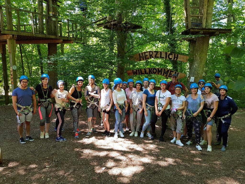Auch dieses Jahr waren alle haupt- und ehrenamtlichen Mitarbeiter des Altenzentrums St. Elisabeth zu einem gemeinsamen Ausflug eingeladen. Für die schwindelfreien Mitarbeiter wurde am 05.07.2019 ein Besuch des Kletterparks Lichtenstein mit anschließendem Grillen bei der Tobelmühle organisiert. Für den anderen Teil der Mitarbeiter wurde eine Führung durch das Schloss Lichtenstein und eine kurze, gemütliche Wanderung angeboten. Wer sich für diesen Ausflug entschied, erlebte einen ganzen Tag gemeinsam mit den Kollegen. Um 10 Uhr trafen sich alle im Atrium des Altenzentrums St. Elisabeth um gemeinsam in den Kletterpark zu fahren. Dort waren gut zwei Stunden Action angesagt. Im Anschluss wurde dann direkt an der Echazquelle gemeinsam gegrillt. |