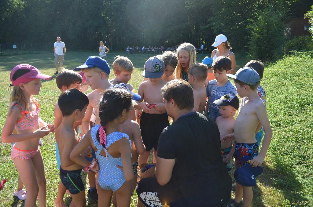 Auch in diesem Jahre gab es wieder reichlich Gelegenheit, ein Sommerabschlussfest mit unseren KiSS-Kindern zu feiern. Besonders unsere zwei FSJler wollten nochmals die Chance nutzen, sich bei allen Kindern zu verabschieden und die Zeit noch ein letztes Mal zusammen zu genießen. Am 23. Juli 2019, machten sich somit ca. 40 Kinder mit Ihren Eltern auf den Weg ins Waldheim. Für die Kinder war an diesem Tag ein großer Parcours mit unterschiedlichen Stationen aufgebaut. Nachdem alle Kinder alleine, oder in Grüppchen sich an die einzelnen Stationen rangemacht hatten und dort Zeit hatten, sich auszutoben, erschallte auf dem Parkplatz des Waldheims eine Musik, die den meisten Kindern bekannt waren: der Eismann Toni war da. Zur Erfrischung gab es also für jedes Kind, und auch für jeden Elternteil eine Kugel Eis. Zudem stand den ganzen Nachmittag ein gesunder Wagen mit Wassermelone, Gurke und Karotte für Groß und Klein zur Verfügung. Bevor wir nun aber noch gemeinsam vesperten und gemütlich zusammensaßen, hatten wir für die Kinder noch ein kleines Gruppenspiel (Wassertransport) geplant, das im Team gemeistert werden sollte. Hierbei konnte man strahlenden Kindern in die Augen schauen, die sich alle über eine kleine Abkühlung freuten. Zufrieden und glücklich ließen alle den Abend mit belegten Brötchen ausklingen. |