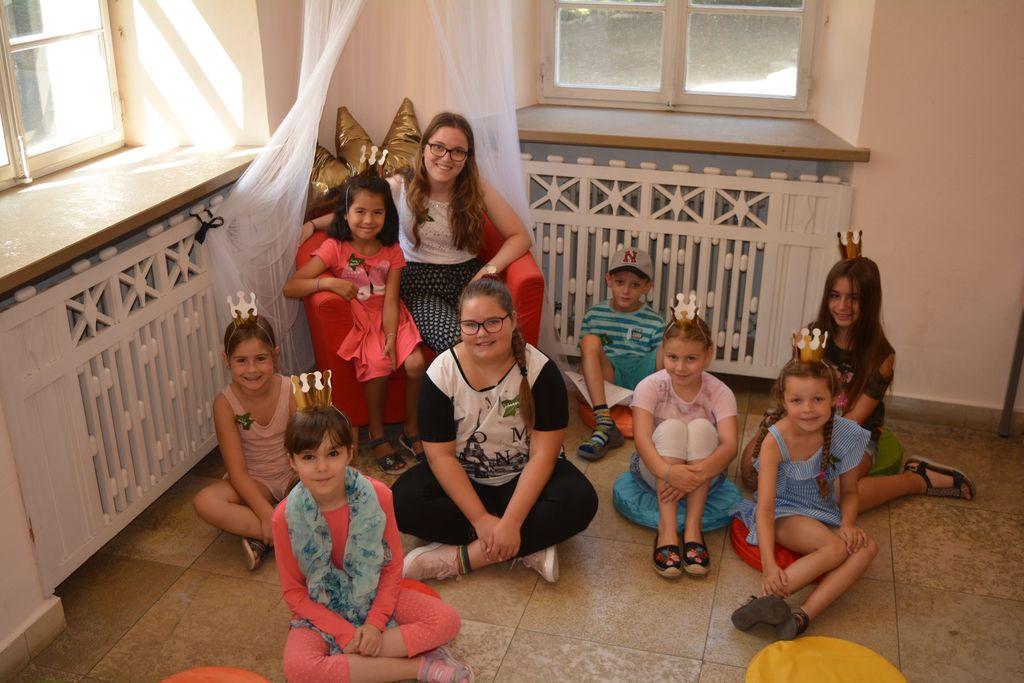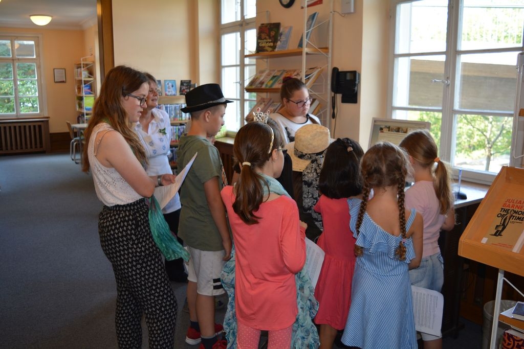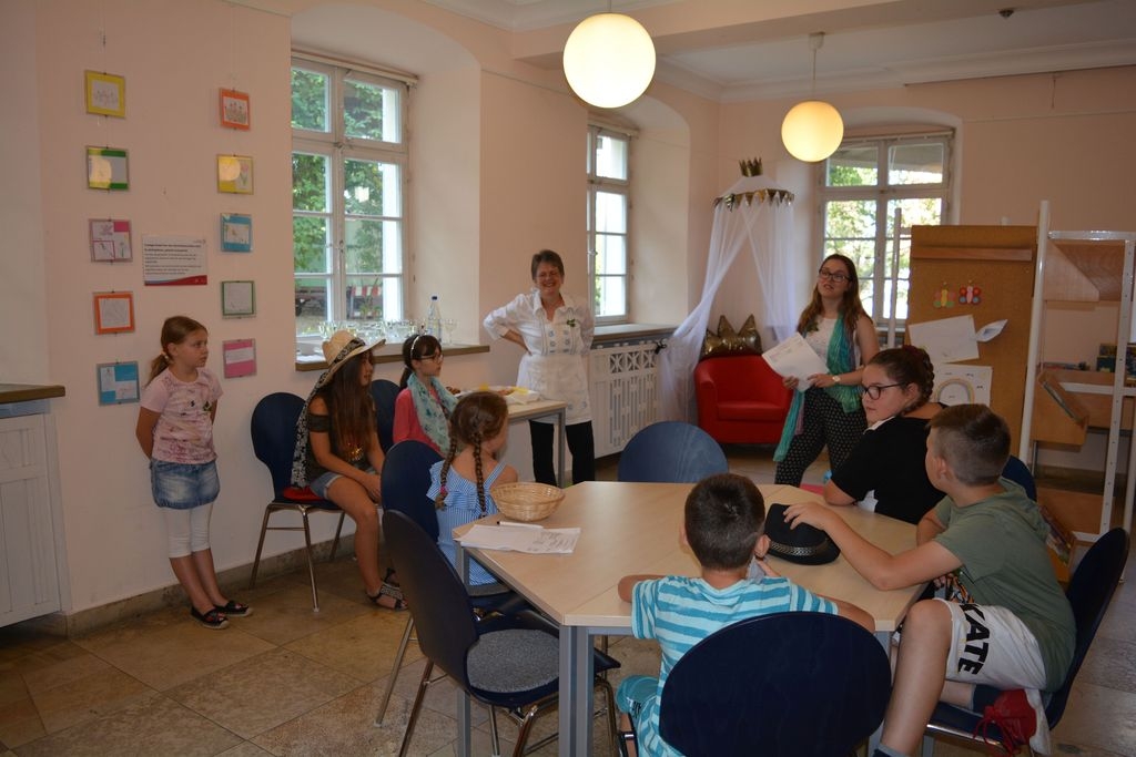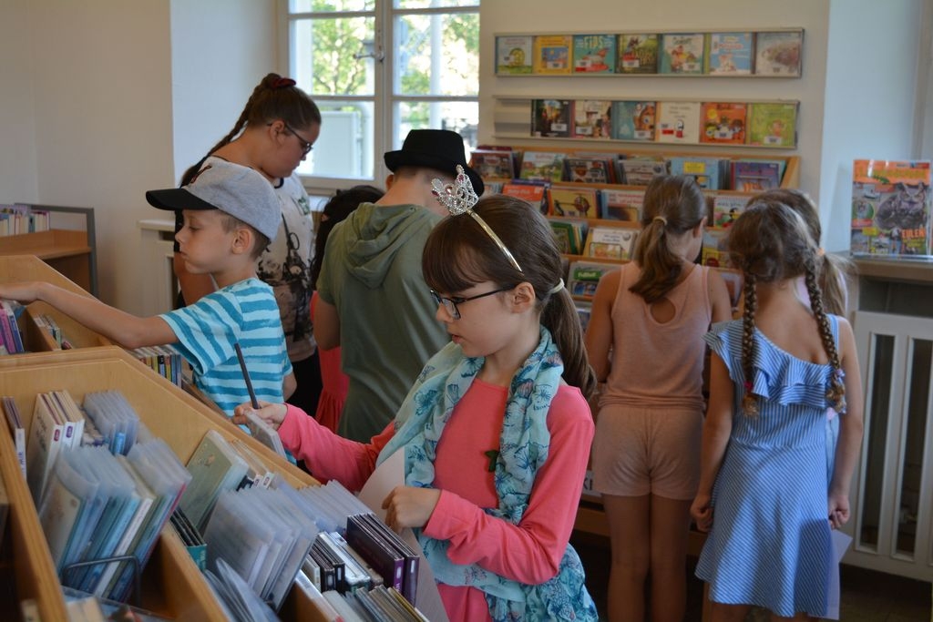 Die neun Kinder, die sich für die Schloss-Matinee beim diesjährigen Sommerferienprogramm angemeldet hatten, erwartete in der Stadtbücherei Eislingen eine spielerische Führung, bei der sie schrittweise die Bibliothek erkunden und das vielfältige Medienangebot im historischen Schlossgebäude kennenlernen konnten. Zur Begrüßung gab es für die kleinen Gäste leckere Getränke, Laugen-Mäuschen und Obstspieße. Außerdem standen den Kindern Accessoires wie Hüte und Schals zur Verfügung, mit welchen sie sich verkleiden konnten, um wie Gäste der Gräfin von Rechberg auszusehen, die „offiziell“ zur Schloss-Matinee eingeladen hatte. Nachdem sich alle gestärkt hatten und mit selbstgebastelten Namensschildern ausgestattet waren, um leichter neue Kontakte knüpfen zu können, stand eine Schatzsuche auf dem Programm. Die Kinder erfuhren, dass an einem geheimen Ort im Schloss eine Schatzkiste versteckt sei, in der sich ihre Geschenke befinden würden. Um diese zu finden, müssten alle an einem Strang ziehen und gemeinsam eine Liste voller Fragen beantworten. Die gesuchten Medien waren auf die Schloss-Thematik der Veranstaltung zugeschnitten und führte die Kinder durch alle Stockwerke der Stadtbücherei.