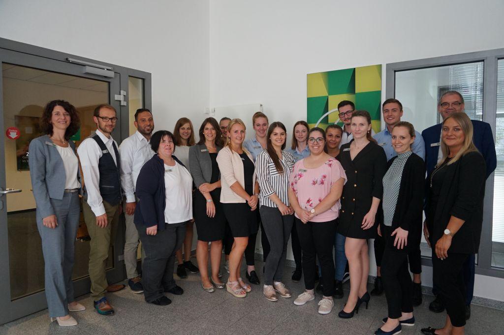 Erfolgreich haben 14 Auszubildende der AOK Neckar-Fils jetzt ihre Berufsausbildung beendet. Im Rahmen einer kleinen Feier überreichte die stellvertretende AOK-Geschäftsführerin Heike Kallfass den jungen Absolventen die Zeugnisse. Für zwei Prüflingen gab es die Traumnote 1. Mit Bestehen der Prüfung werden die jungen Sozialversicherungs-Fachangestellten und Kauffrauen für Dialogmarketing in ein unbefristetes Arbeitsverhältnis übernommen. Sie können nun in ihrem Beruf durchstarten – innerhalb der AOK bieten sich viele Karrieremöglichkeiten an. Die stellvertretende AOK-Geschäftsführerin Heike Kallfass und Ausbildungsleiter Michael Ehret (von links) mit den jungen Absolventen. Foto: AOK Neckar-Fils |