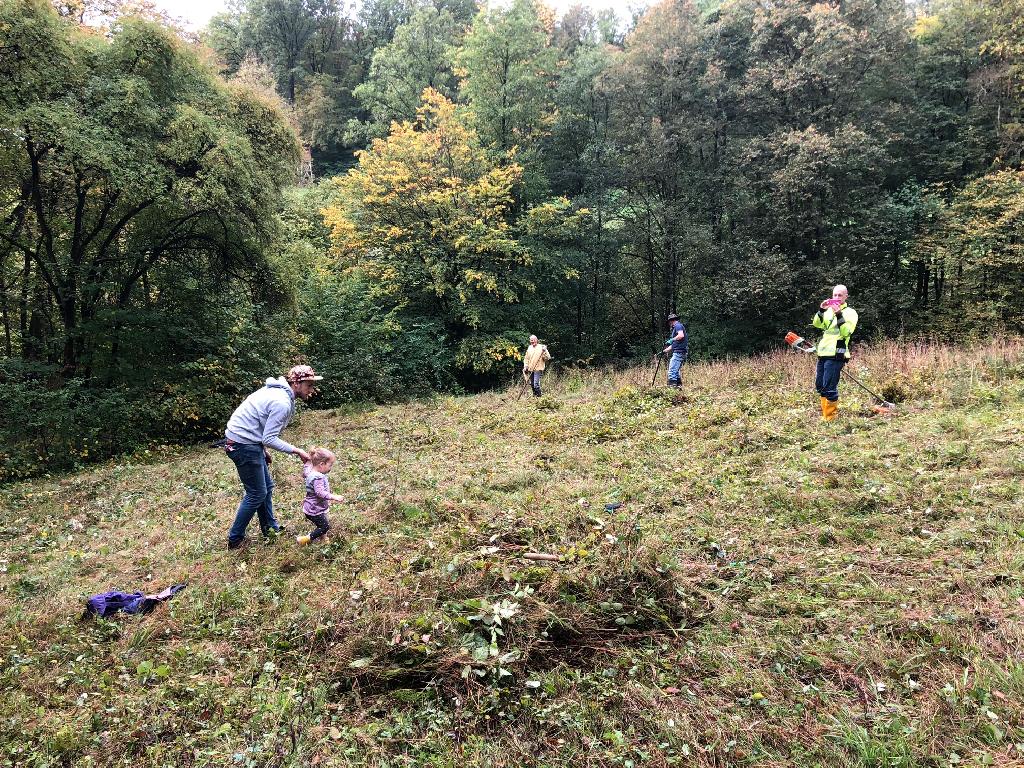Bereits zum 26. Mal wurde die kleine Waldwiese auf Initiative vom BUND gemäht und das Mähgut abgeräumt. Dieses Mal mit Unterstützung von einigen Aktivisten der Eislinger Cleanup- Gruppe und Helfern aus dem grünen Umfeld. BUND-Sprecher Gerhard Rink: 'Es würde nur wenige Jahre dauern, dann wäre es vorbei mit der Blütenpracht und die Wiese wäre wieder Wald'. Der Aufwand lohnt sich. Neben den Betonien blühen im späten Sommer hunderte Hainflockenblumen, die in unserer Gegend an ihrer östlichen Verbreitungsgrenze leben und selten in dieser großen Zahl anzutreffen sind. Im Sommer locken die gelben Stauden des Färberginsters zahlreiche Insekten an. Neben vielen weiteren Blütenpflanzen leben Zauneidechsen auf der Wiese und sie dient als Rückzugsraum für Feuersalamander, Erdkröten und Grasfrösche. Der Blütenreichtum zieht im Frühling und Sommer verschiedene Schmetterlingsarten und viele weitere Insekten an, erklärt Holger Haas.
