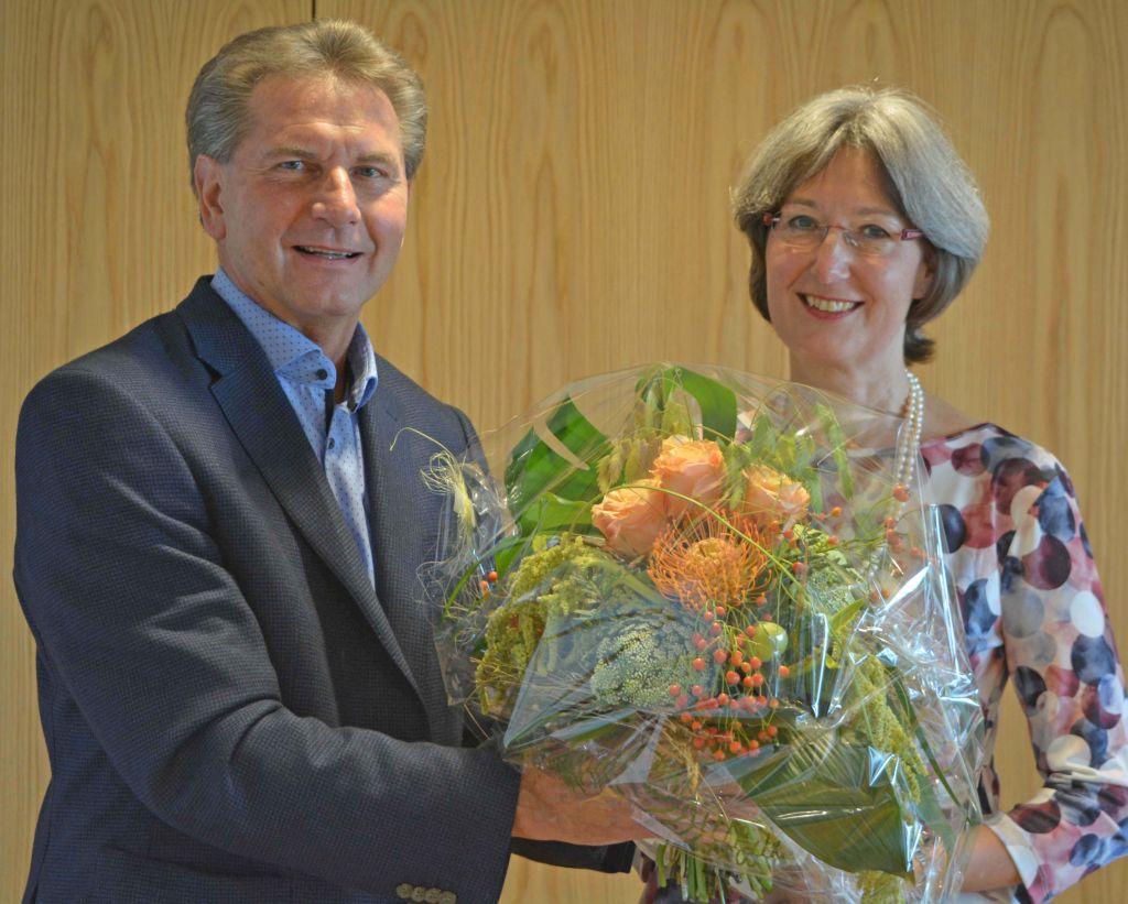 Die Glückwünsche der Kolleginnen und Kollegen überbrachte die Leitern der Volkshochschule, Ute Schwendemann. In einem Blick zurück machte sie deutlich, welchen Herausforderungen sich die Amtsleiterin in vier Jahrzehnten stellen musste. Besonders die Einführung der EDV hatte die behördliche Arbeitswelt grundlegend verändert und der kontinuierliche Zuwachs an Aufgaben und der damit verbundenen Verantwortung waren ständige Wegbegleiter in den letzten Jahren. Mit einem Geschenk bedankte sie sich für die gute Zusammenarbeit.