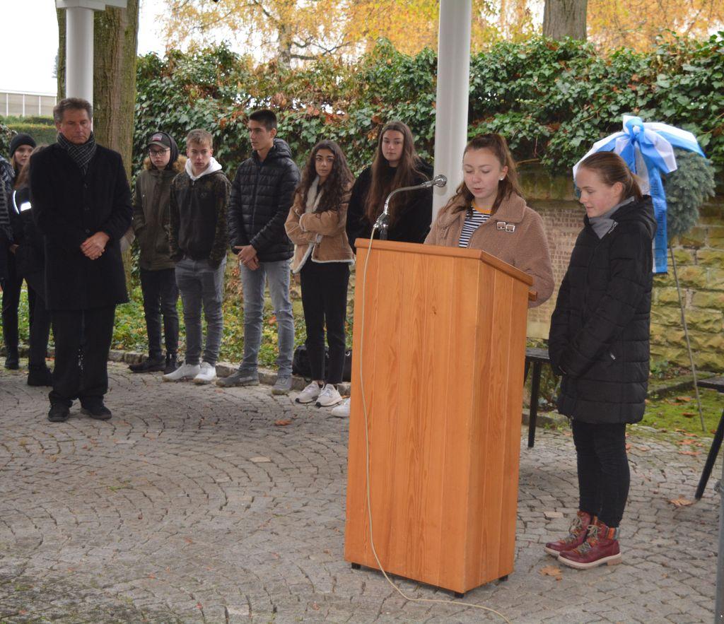 Denn wer glaube, dass Demokratie und deren freiheitliche Grundformen selbstverständlich seien, müsse nur in die jüngste Vergangenheit blicken. Dazu gäbe es gäbe es heutzutage genügend Beispiele. „Demokratie müssen wir uns verdienen“, so das Stadtoberhaupt. Er war sich sicher, dass das nur gelingen werde, wenn die Bereitschaft da sei, für die Demokratie aktiv einzutreten und sich gegen gewaltbereite und rassistische Bewegungen zu verteidigen. Das hieße für jeden Einzelnen aufzustehen, Stirn zeigen und nicht wegschauen. Der Blick in die Geschichtsbücher lehre, dass der Frieden in Europa nicht selbstverständlich sei. Das seit über 70 Jahren friedvolle Miteinander mache uns erst bewusst, wie wertvoll die Beziehungen der beteiligten Länder in der Europäische Union sind, um Frieden und Stabilität zu gewährleiten, sagte er überzeugt vom Wirken der Staatengemeinschaft. Zusammen mit dem Stadtoberhaupt übernahmen die Schülerinnen und Schüler der Klasse 9c der DERS die Totenehrung. Im Anschluss trugen die Jugendlichen Friedensgedichte vor und zündeten Kerzen zur Erinnerung an.