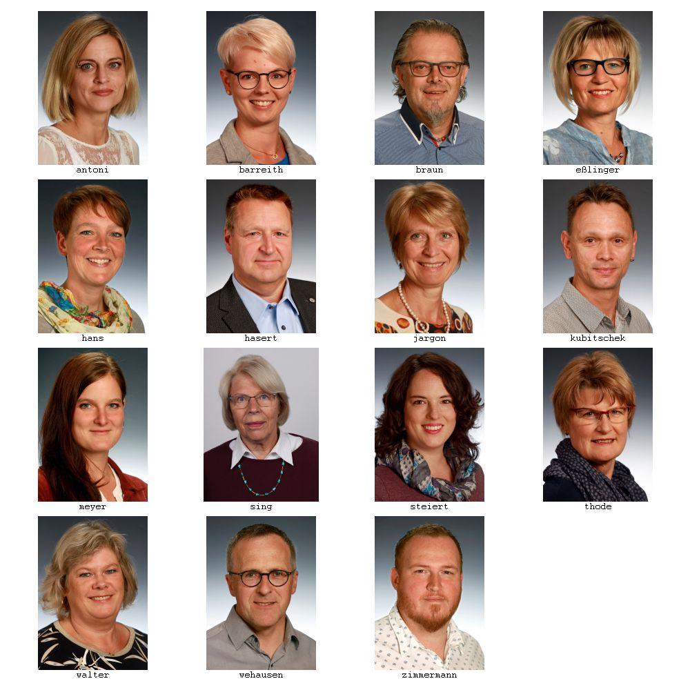 Christina Antoni, Eislingen, 39 Jahre, MtA, verheiratet, 2 Kinder |  Sabine Barreith, Eschenbäche, 30 Jahre, Steuerfachwirtin, verheiratet, 1 Kind |  Andreas Braun, Eislingen, 59 Jahre, Bankkaufmann, geschieden, 2 erwachsene Kinder |  Petra Eßlinger, 51 Jahre, Grundschulkind-Betreuerin, verheiratet, |  Simone Hans, Eislingen, 45 Jahre, Erzieherin, verheiratet, 2 Kinder |  Wolfgang Hasert, Eislingen, 52 Jahre, Maschinenschlosser, verheiratet, 1 Sohn |  Heide Jargon, Ottenbach, 52 Jahre, Reiseverkehrskauffrau, verheiratet, 2 erwachsene Söhne |  Ralf Kubitschek, Ottenbach, 48 Jahre, Softwareentwickler, verheiratet, 2 Kinder |  Susanne Meyer, Rechberghausen, umgemeindet zur Christuskirche, 31 Jahre |  Ingrid Sing, Eislingen, 74 Jahre, Sekretärin i.R. , nicht verheiratet |  Sanja Steiert geb. Hopp, Eislingen, 31 Jahre, Dipl.-Psychologin, verh., 3 Kinder |  Regina Thode, Eislingen, 58 Jahre, Krankenschwester, verwitwet |  Petra Walter, Eislingen, 53 Jahre, Versicherungskauffrau, verheiratet, 2 Kinder |  Rolf Wehausen, Eislingen, 52 Jahre alt, Diplom Chemiker, im Bereich Qualitätsmanagement tätig, verheiratet, 3 Kinder |  Steffen Zimmermann, Ottenbach, 37 Jahre, Einzelhandelskaufmann, verheiratet, keine Kinder | |