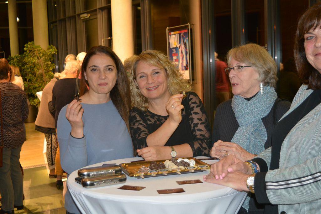 In der Pause wurden im Foyer der Stadthalle handgemachte Pralinen verkostet. Passend dazu hatte Maria Nikolai während der Lesung erzählt, dass sie für den zweiten Teil ihrer „Schokoladenvilla“-Trilogie ein Rezept für Himbeer-Trüffel-Pralinen entwickelt habe, das zudem im Buch abgedruckt ist. Die rund 60 Besucherinnen und Besucher konnten sich hingegen sechs verschiedene Pralinensorten schmecken lassen, die vom Café bzw. von der Konditorei Da Damiano aus Eislingen eigens für diesen Veranstaltungsabend hergestellt worden waren.