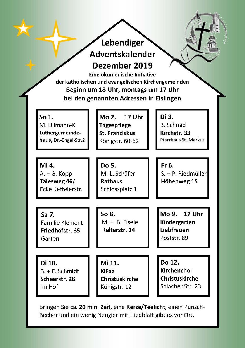 Lebendiger Adventskalender in Eislingen startet am 1.Advent An 23 Abenden im Dezember kreuz und quer durchs Stadtgebiet 26.11.2019 - Ökumenische Initiative