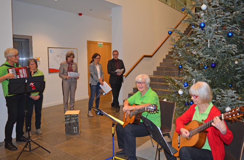 Die Leiterin des Bildungs-, Kultur- und Sportamtens, Maria-Luise Schäfer brachte eine kleine Geschichte mit, die sie gemeinsam mit dem Fachbereichsleiter Bürgerdienste, Oliver Marzian und Alexandra Kröner vom Bildungs-, Kultur- und Sportamt vortrug. Musikalisch umrahmte der Schwäbische Albverein mit Hertraud Melzer und Sonja Weiler an den Gitarren sowie Renate Pfäffle am Akkordeon und Karin Röderer am Cajon. Neben Gedanken und Liedern zur Adventszeit standen auch Gespräche zwischen den Besuchern im Mittelpunkt. Im Anschluss durften sich die Gäste über eine Einladung zum Punsch und weihnachtlichem Gebäck freuen.