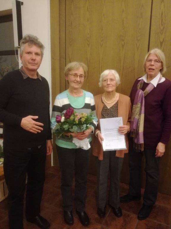 Für 25 Jahre Chormitgliedschaft wurde Marianne Pallasch geehrt, eine Urkunde des Verbands Evangelische Kirchenmusik in Württemberg wurde ihr überreicht. Seit 10 Jahren singen Annemarie und Gerhard Kopp im Chor, besondere Erwähnung verdienen Achim Fröhner für 55 Jahre und Julie Severin für 64 Jahre Zugehörigkeit.
