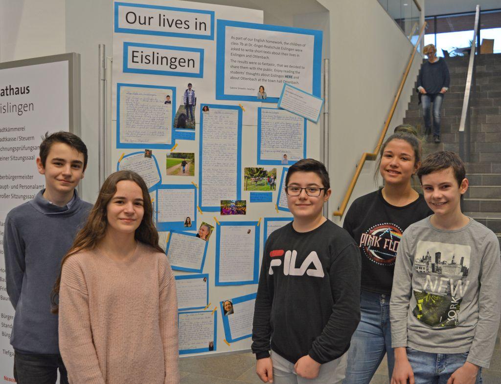Die Schülerinnen und Schüler der Klasse 7b aus der Dr.-Engel-Realschule präsentieren im Rathaus das Ergebnis einer Hausaufgabe aus dem Englischunterricht zum Thema „Leben in der Stadt und auf dem Land“. In den Texten mit dem Titel: „Our lives in Eislingen“ erläutern sie, was ihnen an ihrem Heimatort gefällt. Zusammen mit ihrer Lehrerin Sabine Smeeth haben die 12 bis-13-jährigen Jugendlichen aus Eislingen und Ottenbach ihre englischen Texte anschaulich zusammengestellt, um diese in beiden Rathäusern zu präsentieren. Die Hausaufgaben sind mit einem Foto der jungen Autoren ergänzt.