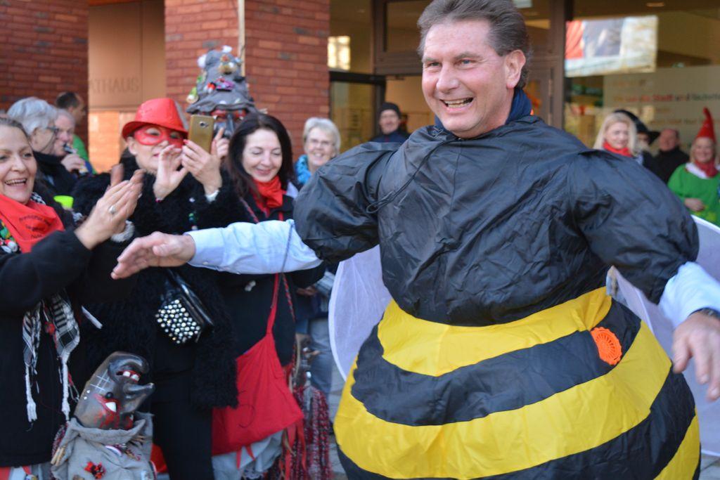 Mit kleinen Schäufelchen musste Oberbürgermeister Klaus Heininger mit Unterstützung einer kleinen Rathausmannschaft das Pflanzloch scharren. Die Baumauswahl ist aber nicht nur eine Frage des individuellen Geschmacks, sondern ureigenste Sache der Brandstifter Hexa. So wurde der kleine Apfelbaum als Narrenbaum geschmückt, um ihn später auf Eislinger Markung nachhaltig auszuwildern. Im Kostüm von Biene Willi musste das Stadtoberhaupt im Anschluss noch allerlei anspruchsvolle Aufgaben bewältigen. Mit im Boot saßen seine Mitarbeiter – allesamt im Bienenkostüm – die sich im Wettstreit rund um das Thema Honig bewähren mussten. Die Anstrengungen hatten sich gelohnt, denn das Lob der Oberhexe blieb nicht aus und das Abschlusstänzchen rund um den Narrenbaum wurde von den zahlreichen Zuschauern mit viel Applaus belohnt. Gegen Ende hatten die Brandstifter Hexa noch eine Überraschung mit im Hexengepäck. Attraktive Preise lockten zum Kauf von Tombola-Losen. Passend zum Thema konnte – wem das Glück hold war – ein Gutschein bei Tante Nelli’s, im Hofladen in Krummwälden oder im Blumenladen Höfer gewonnen werden. Über den gesamten Erlös dürfen sich der Eislinger Waldkindergarten Ameisenstraße und der Naturkinderkindergarten Wiesenwichtel freuen. Für den guten Ton in fantasievollen Kostümen und für Speis und Trank sorgten während des Rathaussturms die Rommdreibr aus Rechberghausen.