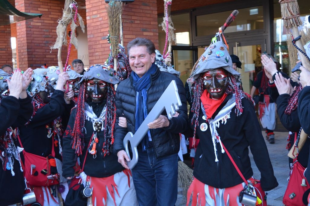 Die zahlreichen Besucher rund um den Schlossplatz applaudierten, als Oberbürgermeister Klaus Heininger symbolisch durch Oberhexe Luprich entmachtet wurde und den überdimensionalen Rathausschlüssel dem Hexenvolk übergab. Das obligatorische Narrengericht entfiel. Dafür erhielt das Stadtoberhaupt eine Nachhilfestunde in Sachen Streuobstbau. „Es geht um Nachhaltigkeit: nicht nur reden, sondern handeln“, wurde das Stadtoberhaupt vor vollendete Tatsachen gestellt. Und Gründe einen Baum zu pflanzen gibt es viele, sprachen die Hexen und verwiesen auf einen aufgeschütteten Erdhaufen mitten auf dem Schlossplatz.