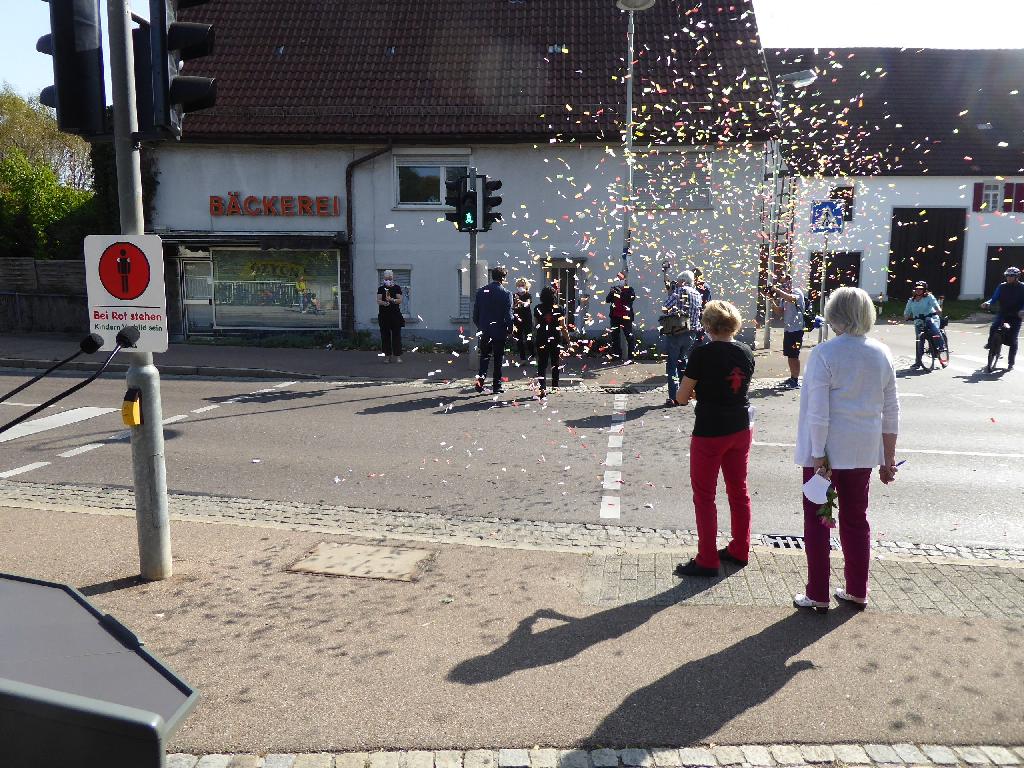 OB Heininger und EfA-Vorsitzende Gönül Neuer beschreiten den Überweg, Konfettiraketen begrüßen sie